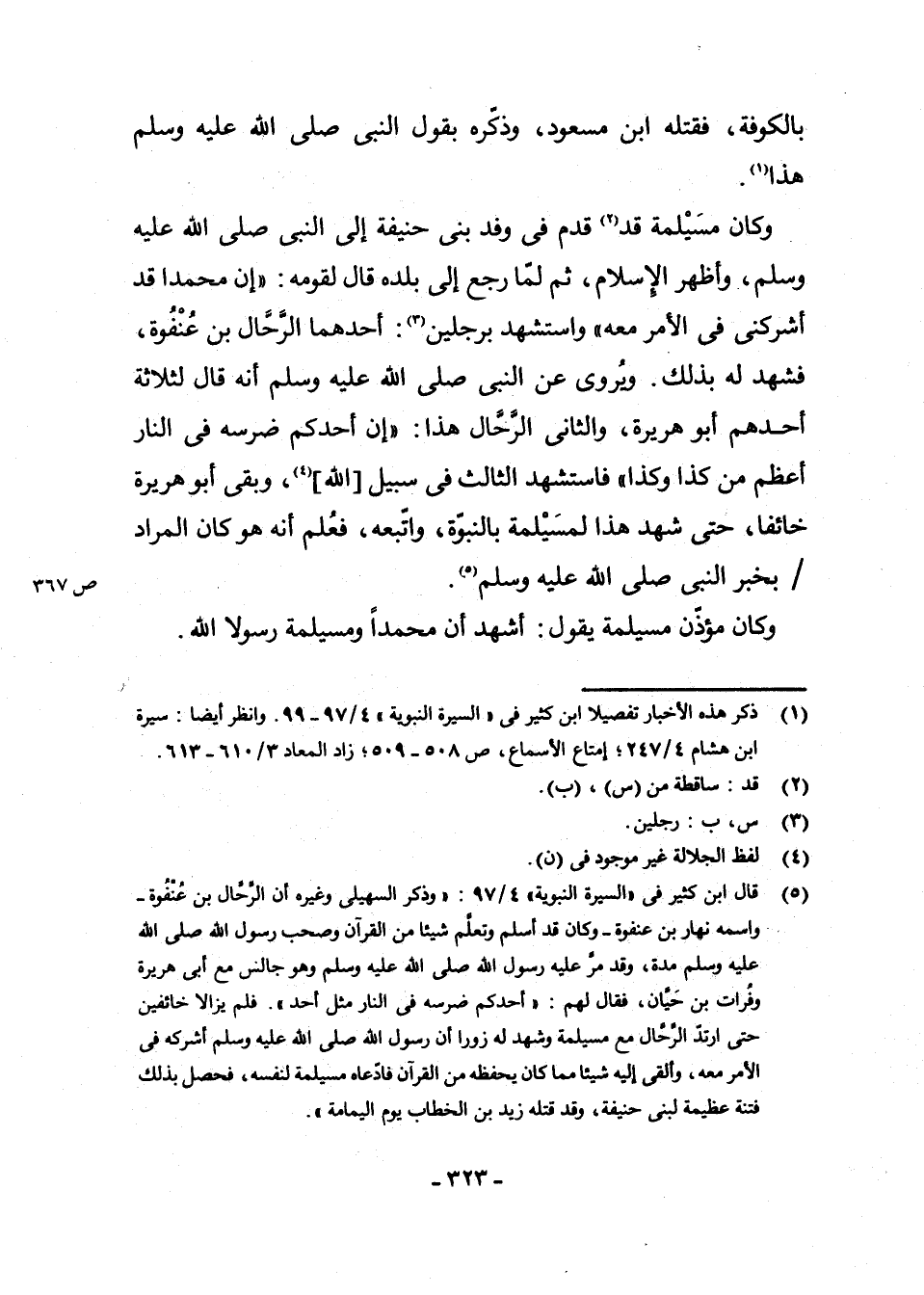 (¬5) قَالَ ابْنُ كَثِيرٍ فِي " السِّيرَةِ النَّبَوِيَّةِ " 4/97: " وَذَكَرَ السُّهَيْلِيُّ وَغَيْرُهُ أَنَّ الرَّحَّالَ بْنَ عُنْفُوَةَ - وَاسْمُهُ نَهَارُ بْنُ عُنْفُوَةَ - وَكَانَ قَدْ أَسْلَمَ وَتَعَلَّمَ شَيْئًا مِنَ الْقُرْآنِ وَصَحِبَ رَسُولَ اللَّهِ - صَلَّى اللَّهُ عَلَيْهِ وَسَلَّمَ - مُدَّةً. وَقَدْ مَرَّ عَلَيْهِ رَسُولُ اللَّهِ - صَلَّى اللَّهُ عَلَيْهِ وَسَلَّمَ - وَهُوَ جَالِسٌ مَعَ أَبِي هُرَيْرَةَ وَفُرَاتِ بْنِ حَيَّانَ، فَقَالَ لَهُمْ: " أَحَدُكُمْ ضِرْسُهُ فِي النَّارِ مِثْلُ أُحُدٍ " فَلَمْ يَزَالَا خَائِفَيْنِ حَتَّى ارْتَدَّ الرَّحَّالُ مَعَ مُسَيْلِمَةَ وَشَهِدَ لَهُ زُورًا أَنَّ رَسُولَ اللَّهِ - صَلَّى اللَّهُ عَلَيْهِ وَسَلَّمَ - أَشْرَكَهُ فِي الْأَمْرِ مَعَهُ وَأَلْقَى إِلَيْهِ شَيْئًا مِمَّا كَانَ يَحْفَظُهُ مِنَ الْقُرْآنِ فَادَّعَاهُ مُسَيْلِمَةُ لِنَفْسِهِ، فَحَصَلَ بِذَلِكَ فِتْنَةٌ عَظِيمَةٌ لِبَنِي حَنِيفَةَ، وَقَدْ قَتَلَهُ زَيْدُ بْنُ الْخَطَّابِ يَوْمَ الْيَمَامَةِ "