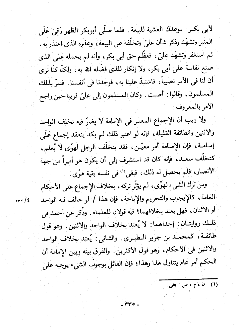 وَلَا رَيْبَ أَنَّ الْإِجْمَاعَ الْمُعْتَبَرَ فِي الْإِمَامَةِ لَا يَضُرُّ فِيهِ تَخَلُّفُ الْوَاحِدِ وَالِاثْنَيْنِ وَالطَّائِفَةِ الْقَلِيلَةِ فَإِنَّهُ لَوِ اعْتُبِرَ ذَلِكَ لَمْ يَكَدْ يَنْعَقِدُ إِجْمَاعٌ عَلَى إِمَامَةٍ؛ فَإِنَّ الْإِمَامَةَ أَمْرٌ مُعَيَّنٌ فَقَدْ يَتَخَلَّفُ الرَّجُلُ لِهَوًى لَا يُعْلَمُ كَتَخَلُّفِ سَعْدٍ فَإِنَّهُ كَانَ قَدِ اسْتَشْرَفَ إِلَى أَنْ يَكُونَ هُوَ أَمِيرًا مِنْ جِهَةِ الْأَنْصَارِ، فَلَمْ يَحْصُلْ لَهُ ذَلِكَ، فَبَقِيَ (¬1) فِي نَفْسِهِ بَقِيَّةُ هَوًى.