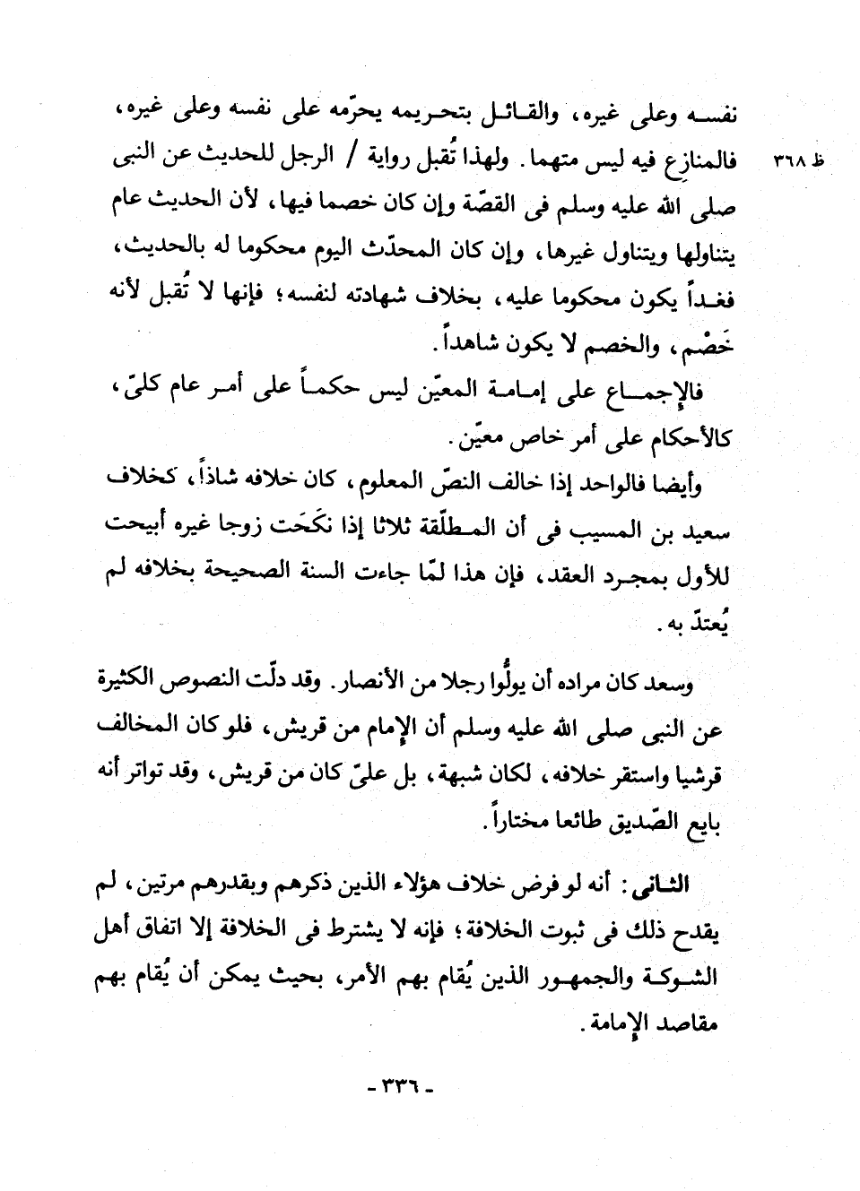 الثَّانِي: أَنَّهُ لَوْ فَرَضَ خِلَافَ هَؤُلَاءِ الَّذِينَ ذَكَرَهُمْ وَبِقَدْرِهِمْ مَرَّتَيْنِ لَمْ يَقْدَحْ ذَلِكَ فِي ثُبُوتِ الْخِلَافَةِ، فَإِنَّهُ لَا يُشْتَرَطُ فِي الْخِلَافَةِ إِلَّا اتِّفَاقُ أَهْلِ الشَّوْكَةِ وَالْجُمْهُورِ الَّذِينَ يُقَامُ بِهِمُ الْأَمْرُ بِحَيْثُ يُمْكِنُ أَنْ يُقَامَ بِهِمْ مَقَاصِدُ الْإِمَامَةِ.