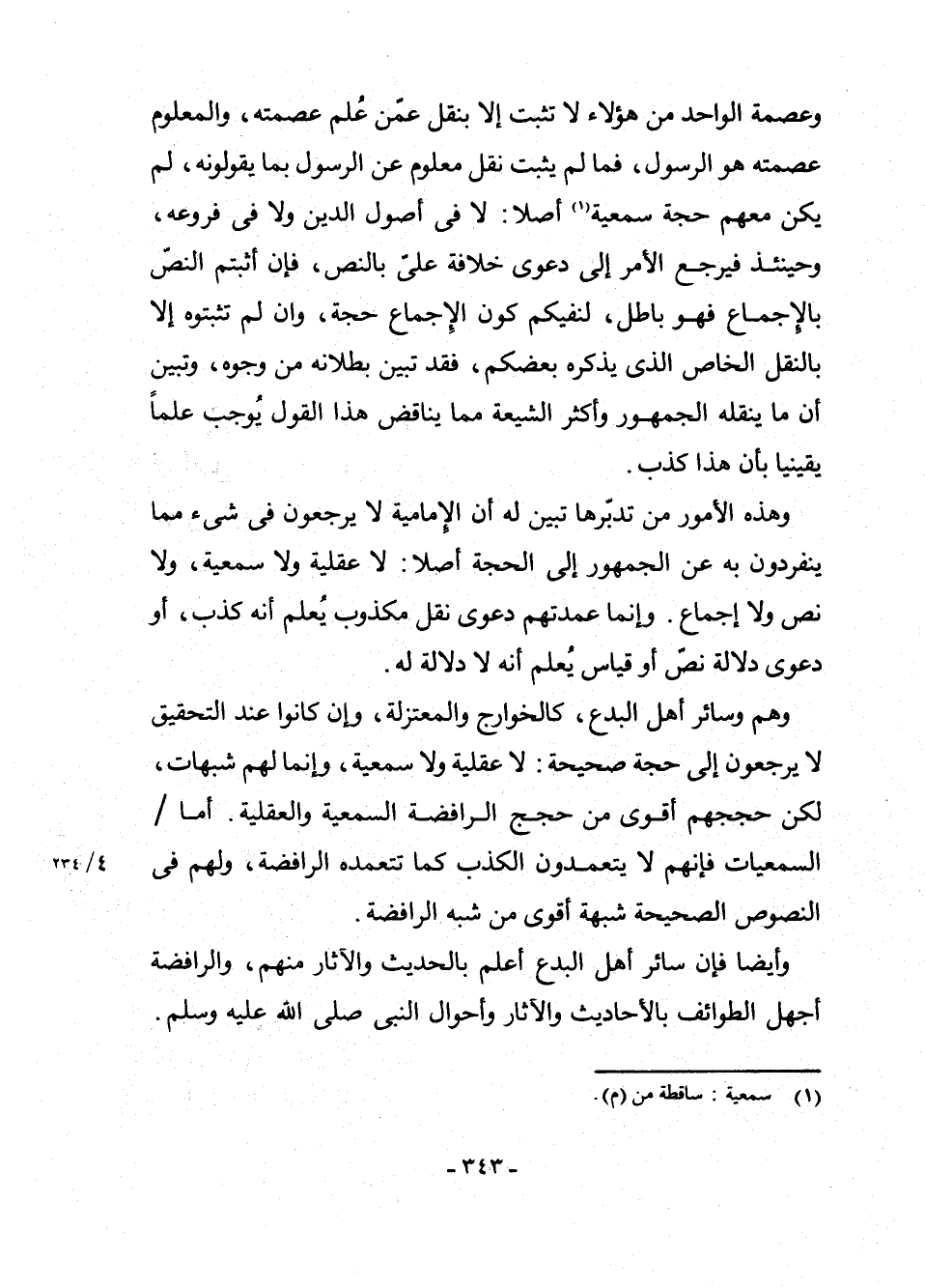 وَهَذِهِ الْأُمُورُ مَنْ تَدَبَّرَهَا تَبَيَّنَ لَهُ أَنَّ الْإِمَامِيَّةَ لَا يَرْجِعُونَ فِي شَيْءٍ مِمَّا يَنْفَرِدُونَ بِهِ عَنِ الْجُمْهُورِ إِلَى الْحُجَّةِ أَصْلًا: لَا عَقْلِيَّةٍ وَلَا سَمْعِيَّةٍ، وَلَا نَصٍّ وَلَا إِجْمَاعٍ؛ وَإِنَّمَا عُمْدَتُهُمْ دَعْوَى نَقْلٍ مَكْذُوبٍ يُعْلَمُ أَنَّهُ كَذِبٌ، أَوْ دَعْوَى دَلَالَةِ نَصٍّ، أَوْ قِيَاسٍ يُعْلَمُ أَنَّهُ لَا دَلَالَةَ لَهُ.