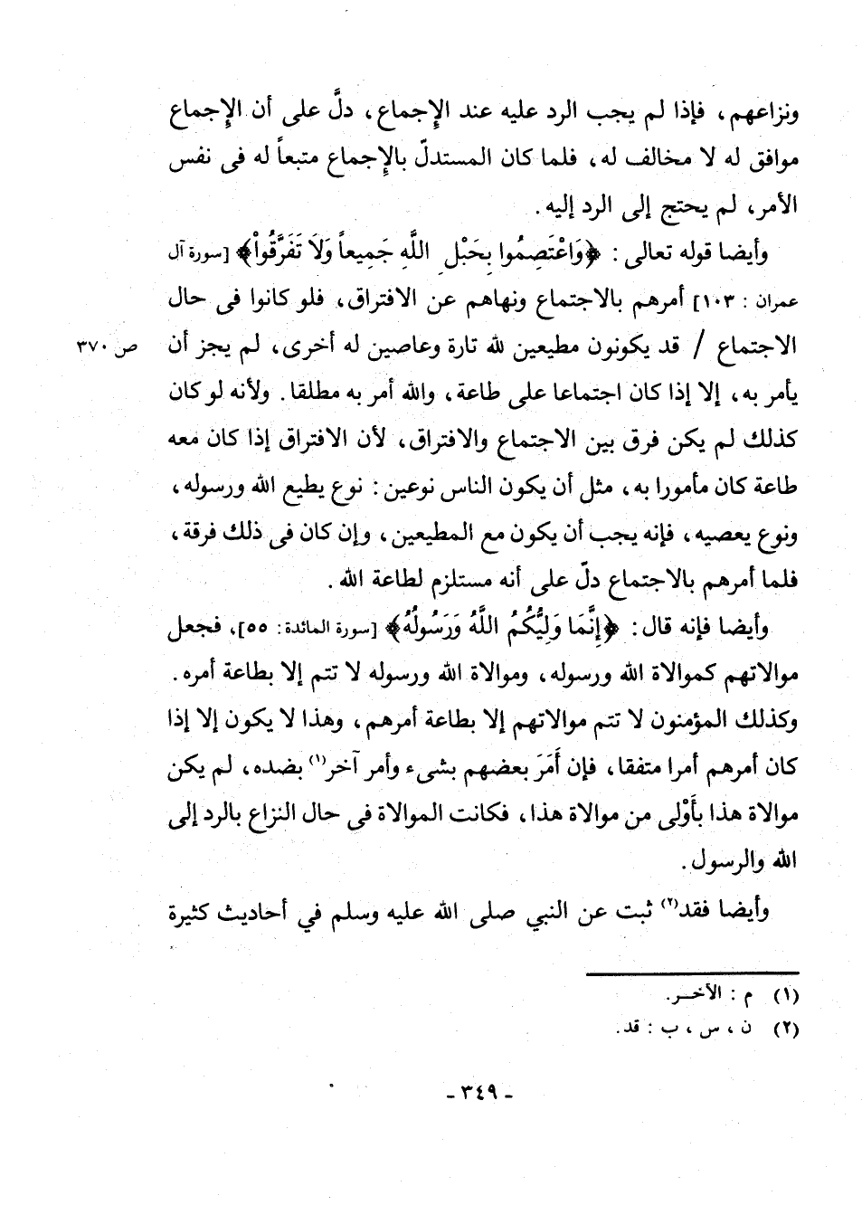 وَأَيْضًا قَوْلُهُ تَعَالَى: {وَاعْتَصِمُوا بِحَبْلِ اللَّهِ جَمِيعًا وَلَا تَفَرَّقُوا} [سُورَةُ آلِ عِمْرَانَ: 103] أَمَرَهُمْ بِالِاجْتِمَاعِ وَنَهَاهُمْ عَنْ الِافْتِرَاقِ فَلَوْ كَانَ فِي حَالِ الِاجْتِمَاعِ قَدْ يَكُونُونَ مُطِيعِينَ لِلَّهِ تَارَةً وَعَاصِينَ لَهُ أُخْرَى لَمْ يَجُزْ أَنْ يَأْمُرَ بِهِ إِلَّا إِذَا كَانَ اجْتِمَاعًا عَلَى طَاعَةٍ؛ وَاللَّهُ أَمَرَ بِهِ مُطْلَقًا ; وَلِأَنَّهُ لَوْ كَانَ كَذَلِكَ لَمْ يَكُنْ فَرْقٌ بَيْنَ الِاجْتِمَاعِ وَالِافْتِرَاقِ، لِأَنَّ الِافْتِرَاقَ إِذَا كَانَ مَعَهُ طَاعَةٌ كَانَ مَأْمُورًا بِهِ مِثْلَ أَنْ يَكُونَ النَّاسُ نَوْعَيْنِ نَوْعٌ يُطِيعُ اللَّهَ وَرَسُولَهُ وَنَوْعٌ يَعْصِيهِ؛ فَإِنَّهُ يَجِبُ أَنْ يَكُونَ مَعَ الْمُطِيعِينَ، وَإِنْ كَانَ فِي ذَلِكَ فُرْقَةٌ، فَلَمَّا أَمَرَهُمْ بِالِاجْتِمَاعِ دَلَّ عَلَى أَنَّهُ مُسْتَلْزِمٌ لِطَاعَةِ اللَّهِ.