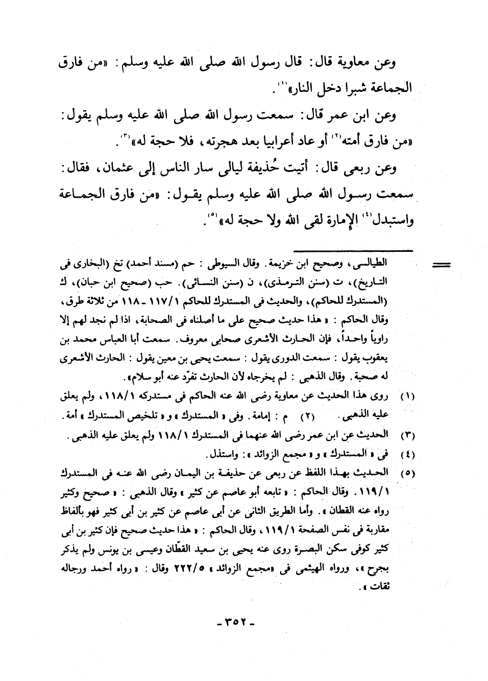 وَعَنْ مُعَاوِيَةَ قَالَ: قَالَ رَسُولُ اللَّهِ - صَلَّى اللَّهُ عَلَيْهِ وَسَلَّمَ -: " «مَنْ فَارَقَ الْجَمَاعَةَ شِبْرًا دَخَلَ النَّارَ» " (¬1) .