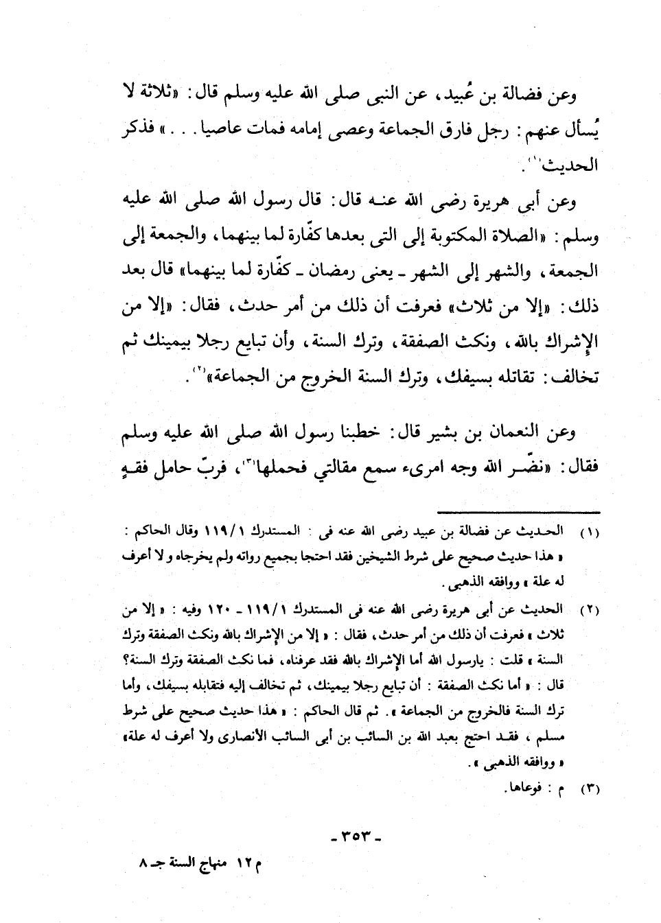 (¬2) الْحَدِيثُ عَنْ أَبِي هُرَيْرَةَ - رَضِيَ اللَّهُ عَنْهُ - فِي الْمُسْتَدْرَكِ 1/119 - 120 وَفِيهِ: " إِلَّا مِنْ ثَلَاثٍ " فَعَرَفْتُ أَنَّ ذَلِكَ مِنْ أَمْرٍ حَدَثَ، فَقَالَ: " إِلَّا مِنَ الْإِشْرَاكِ بِاللَّهِ وَنَكْثِ الصَّفْقَةِ وَتَرْكِ السُّنَّةِ " قُلْتُ: يَا رَسُولَ اللَّهِ أَمَّا الْإِشْرَاكُ بِاللَّهِ فَقَدْ عَرَفْنَاهُ، فَمَا نَكْثُ الصَّفْقَةِ وَتَرْكُ السُّنَّةِ؟ قَالَ: " أَمَّا نَكْثُ الصَّفْقَةِ: أَنْ تُبَايِعَ رَجُلًا بِيَمِينِكَ، ثُمَّ تُخَالِفَ إِلَيْهِ فَتُقَابِلُهُ بِسَيْفِكَ، وَأَمَّا تَرْكُ السُّنَّةِ فَالْخُرُوجُ مِنَ الْجَمَاعَةِ ". ثُمَّ قَالَ الْحَاكِمُ: " هَذَا حَدِيثٌ صَحِيحٌ عَلَى شَرْطِ مُسْلِمٍ؛ فَقَدِ احْتَجَّ بِعَبْدِ اللَّهِ بْنِ السَّائِبِ بْنِ أَبِي السَّائِبِ الْأَنْصَارِيِّ وَلَا أَعْرِفُ لَهُ عِلَّةً " وَوَافَقَهُ الذَّهَبِيُّ