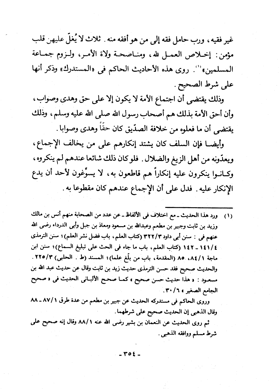 غَيْرُ فَقِيهٍ، وَرُبَّ حَامِلِ فِقْهٍ إِلَى مَنْ هُوَ أَفْقَهُ مِنْهُ. ثَلَاثٌ لَا يُغَلُّ عَلَيْهِنَّ قَلْبٌ مُؤْمِنٌ: إِخْلَاصُ الْعَمَلِ لِلَّهِ وَمُنَاصَحَةُ وُلَاةِ الْأَمْرِ وَلُزُومُ جَمَاعَةِ الْمُسْلِمِينَ» " (¬1) رَوَى هَذِهِ الْأَحَادِيثَ الْحَاكِمُ فِي " الْمُسْتَدْرَكِ " وَذَكَرَ أَنَّهَاعَلَى شَرْطِ الصَّحِيحِ.