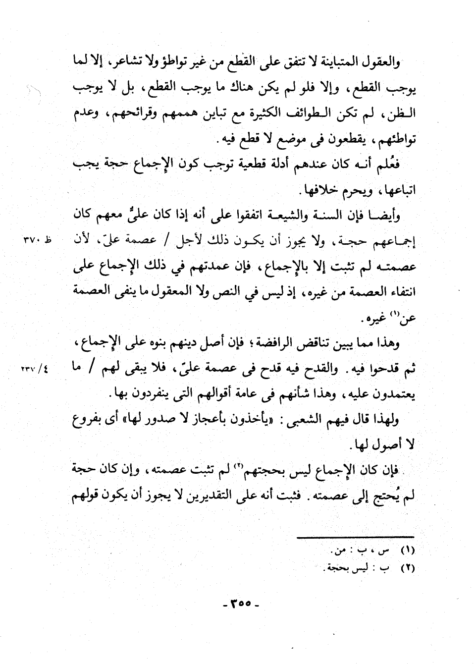 وَأَيْضًا فَإِنَّ السُّنَّةَ وَالشِّيعَةَ اتَّفَقُوا عَلَى أَنَّهُ إِذَا كَانَ عَلِيٌّ مَعَهُمْ كَانَ إِجْمَاعُهُمْ حُجَّةً. وَلَا يَجُوزُ أَنْ يَكُونَ ذَلِكَ لِأَجْلِ عِصْمَةِ عَلِيٍّ؛ لِأَنَّ عِصْمَتَهُ لَمْ تَثْبُتْ إِلَّا بِالْإِجْمَاعِ، فَإِنَّ عُمْدَتَهُمْ فِي ذَلِكَ الْإِجْمَاعُ عَلَى انْتِفَاءِ الْعِصْمَةِ مِنْ غَيْرِهِ إِذْ لَيْسَ فِي النَّصِّ وَلَا الْمَعْقُولِ مَا يَنْفِي الْعِصْمَةَ عَنْ (¬1) غَيْرِهِ.