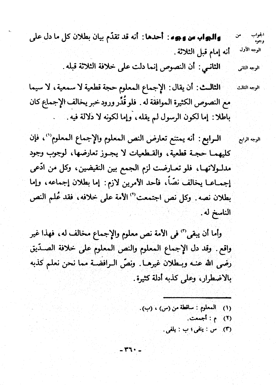 وَأَمَّا أَنْ يَبْقَى (¬3) فِي الْأُمَّةِ نَصٌّ مَعْلُومٌ وَالْإِجْمَاعُ مُخَالِفٌ لَهُ؛ فَهَذَا غَيْرُ وَاقِعٍ وَقَدْ دَلَّ الْإِجْمَاعُ الْمَعْلُومُ وَالنَّصُّ الْمَعْلُومُ عَلَى خِلَافَةِ الصِّدِّيقِ - رَضِيَ اللَّهُ عَنْهُ - وَبُطْلَانِ غَيْرِهَا. وَنَصُّ الرَّافِضَةِ مِمَّا نَحْنُ نَعْلَمُ كَذِبَهُ بِالِاضْطِرَارِ وَعَلَى كَذِبِهِ أَدِلَّةٌ كَثِيرَةٌ.
