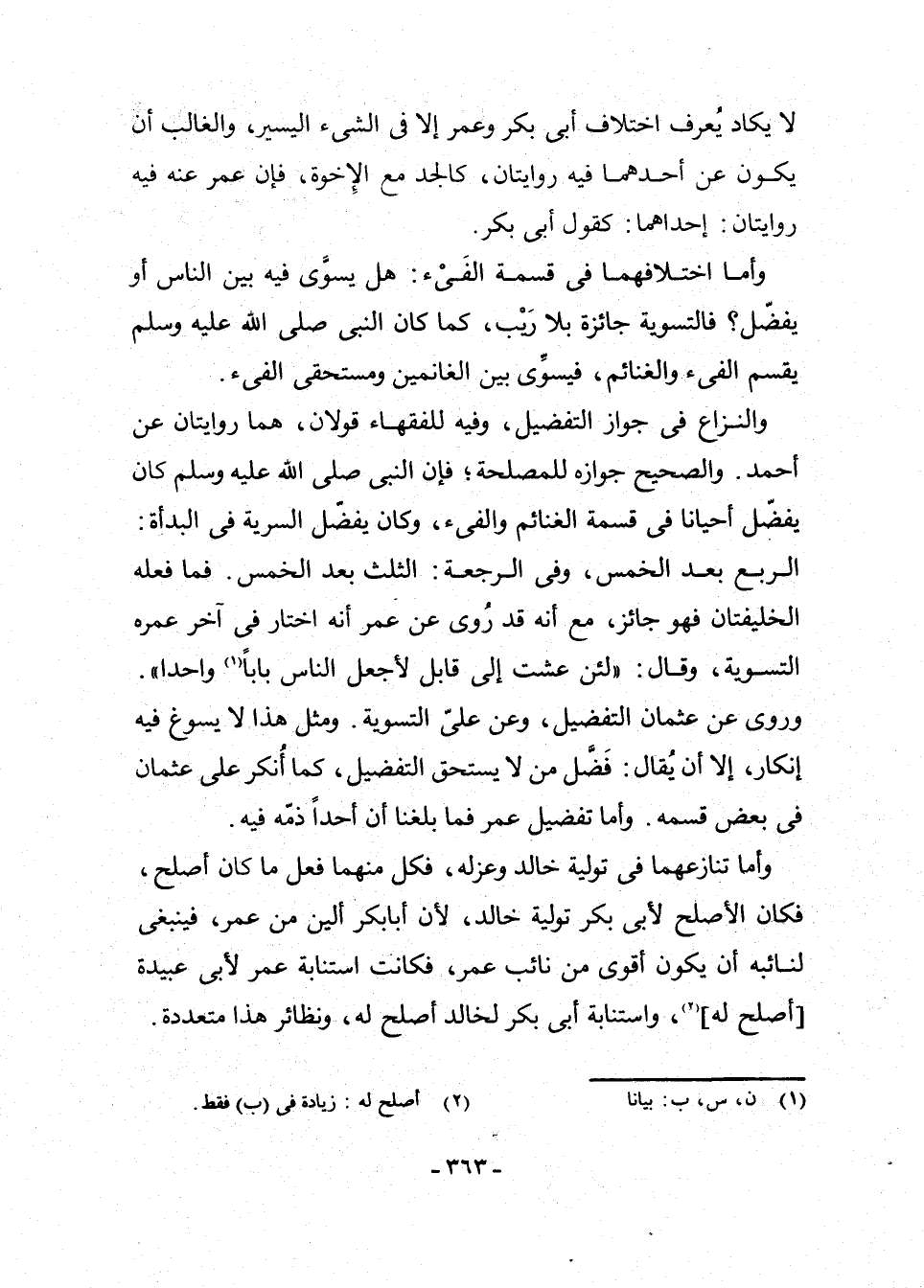 وَالنِّزَاعُ فِي جَوَازِ التَّفْضِيلِ، وَفِيهِ لِلْفُقَهَاءِ قَوْلَانِ، هُمَا رِوَايَتَانِ عَنْ أَحْمَدَ. وَالصَّحِيحُ جَوَازُهُ لِلْمَصْلَحَةِ؛ فَإِنَّ النَّبِيَّ - صَلَّى اللَّهُ عَلَيْهِ وَسَلَّمَ - كَانَ يُفَضِّلُ أَحْيَانًا فِي قِسْمَةِ الْغَنَائِمِ وَالْفَيْءِ، وَكَانَ يُفَضِّلُ السَّرِيَّةَ فِي الْبَدْأَةِ: الرُّبْعُ بَعْدَ الْخُمُسِ، وَفِي الرَّجْعَةِ: الثُّلُثُ بَعْدَ الْخُمُسِ؛ فَمَا فَعَلَهُ الْخَلِيفَتَانِ فَهُوَ جَائِزٌ؛ مَعَ أَنَّهُ قَدْ رَوَى عَنْ عُمَرَ أَنَّهُ اخْتَارَ فِي آخِرِ عُمُرِهِ التَّسْوِيَةَ وَقَالَ لَئِنْ عِشْتُ إِلَى قَابِلٍ لَأَجْعَلَ النَّاسَ بَابًا (¬1) وَاحِدًا ".