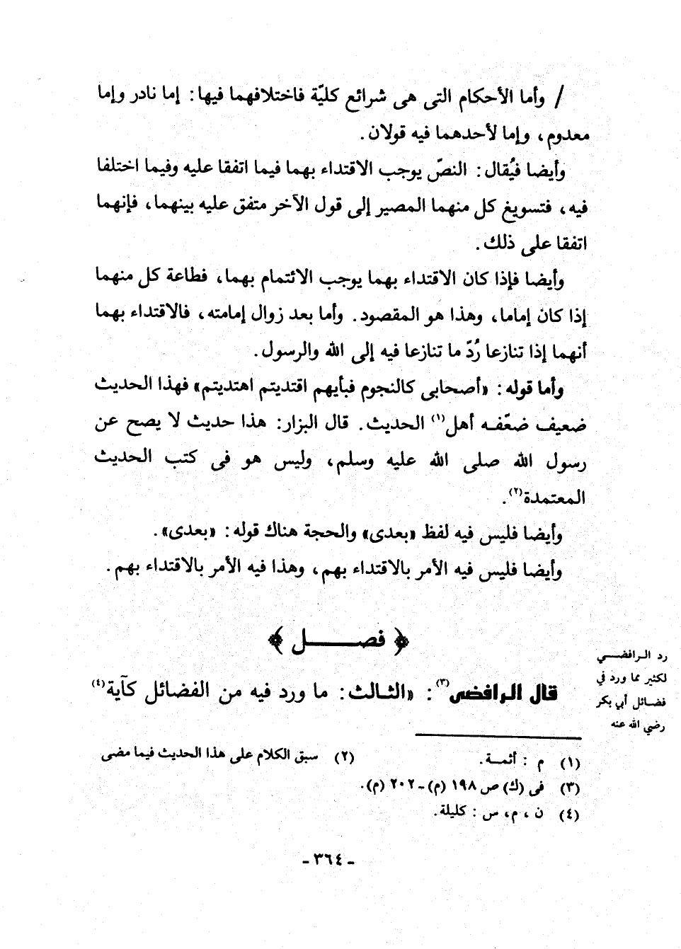 وَأَمَّا قَوْلُهُ: " «أَصْحَابِي كَالنُّجُومِ فَبِأَيِّهِمُ اقْتَدَيْتُمُ اهْتَدَيْتُمْ» "، فَهَذَا الْحَدِيثُ ضَعِيفٌ ضَعَّفَهُ أَهْلُ (¬1) الْحَدِيثِ؛ قَالَ الْبَزَّارُ: هَذَا حَدِيثٌ لَا يَصِحُّ عَنْ رَسُولِ اللَّهِ - صَلَّى اللَّهُ عَلَيْهِ وَسَلَّمَ -، وَلَيْسَ هُوَ فِي كُتُبِ الْحَدِيثِ الْمُعْتَمِدَةِ (¬2) .