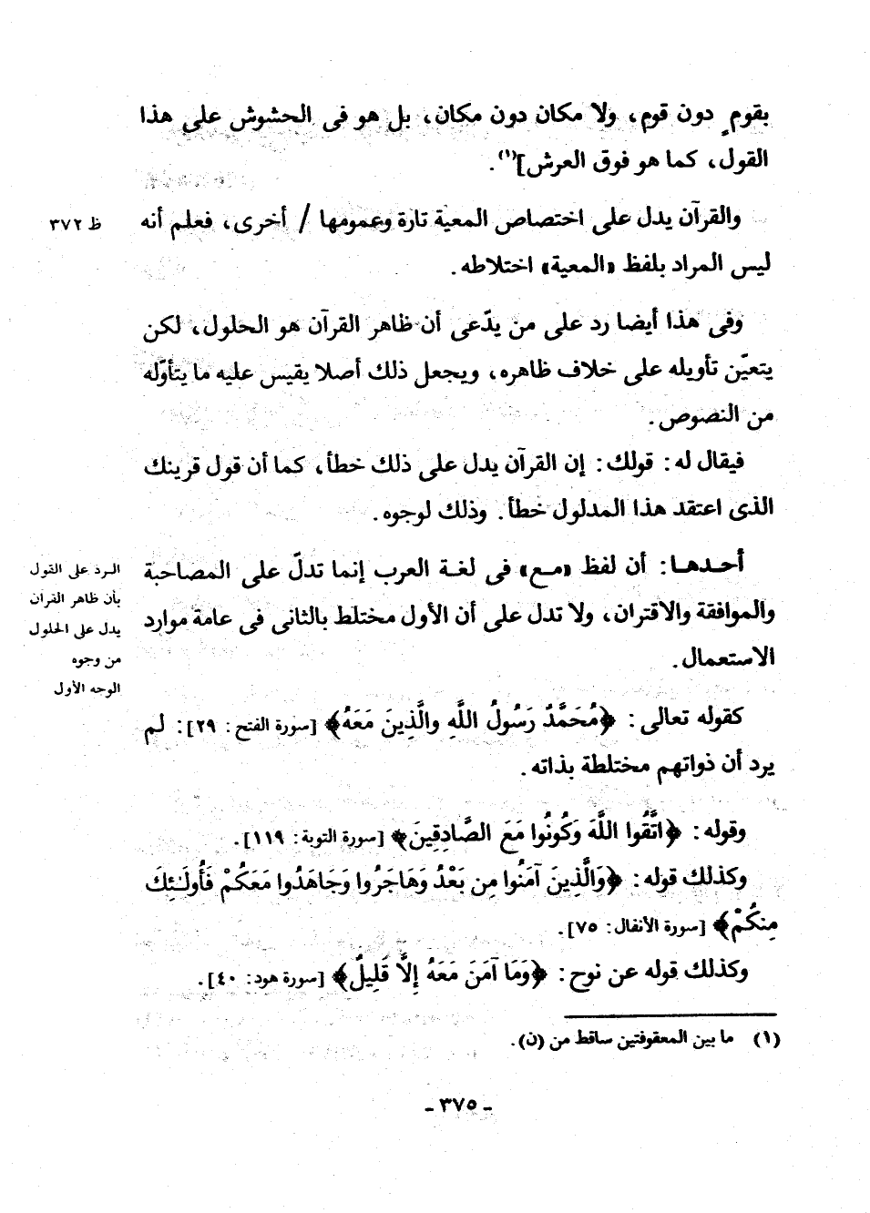 أَحَدُهَا: أَنَّ لَفْظَ (مَعَ) فِي لُغَةِ الْعَرَبِ إِنَّمَا تَدُلُّ عَلَى الْمُصَاحَبَةِ وَالْمُوَافَقَةِ وَالِاقْتِرَانِ، وَلَا تَدُلُّ عَلَى أَنَّ الْأَوَّلَ مُخْتَلِطٌ بِالثَّانِي فِي عَامَّةِ مَوَارِدِ الِاسْتِعْمَالِ.