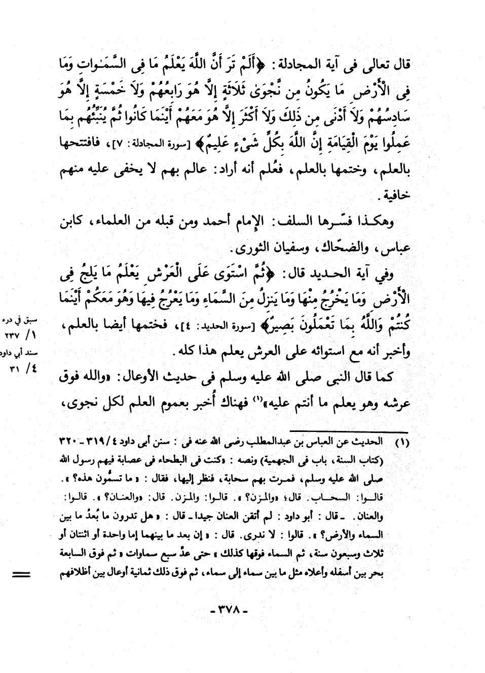 (¬1) الْحَدِيثُ عَنِ الْعَبَّاسِ بْنِ عَبْدِ الْمُطَّلِبِ - رَضِيَ اللَّهُ عَنْهُ - فِي: سُنَنِ أَبِي دَاوُدَ 4/319 - 320 (كِتَابُ السُّنَّةِ، بَابٌ فِي الْجَهْمِيَّةِ) وَنَصُّهُ: " كُنْتُ فِي الْبَطْحَاءِ فِي عِصَابَةٍ فِيهِمْ رَسُولُ اللَّهِ - صَلَّى اللَّهُ عَلَيْهِ وَسَلَّمَ -، فَمَرَّتْ بِهِمْ سَحَابَةٌ، فَنَظَرَ إِلَيْهَا، فَقَالَ: مَا تُسَمُّونَ هَذِهِ قَالُوا: السَّحَابَ. قَالَ: " وَالْمُزْنَ؟ " قَالُوا: وَالْمُزْنَ. قَالَ: " وَالْعَنَانَ؟ " قَالُوا: وَالْعَنَانَ - قَالَ: أَبُو دَاوُدَ لَمْ أُتْقِنِ الْعَنَانَ جَيِّدًا - قَالَ: " هَلْ تَدْرُونَ مَا بُعْدُ مَا بَيْنَ السَّمَاءِ وَالْأَرْضِ؟ " قَالُوا: لَا نَدْرِي. قَالَ: " إِنَّ بُعْدَ مَا بَيْنَهُمَا إِمَّا وَاحِدَةٌ أَوِ اثْنَانِ أَوْ ثَلَاثٌ وَسَبْعُونَ سَنَةً، ثُمَّ السَّمَاءُ فَوْقَهَا كَذَلِكَ، " حَتَّى عَدَّ سَبْعَ سَمَاوَاتٍ " ثُمَّ فَوْقَ السَّحَابَةِ بَحْرٌ بَيْنَ أَسْفَلِهِ وَأَعْلَاهُ مِثْلُ مَا بَيْنَ سَمَاءٍ إِلَى سَمَاءٍ ثُمَّ فَوْقَ ذَلِكَ ثَمَانِيَةُ أَوْعَالٍ بَيْنَ أَظْلَافِهِمْ وَرُكَبِهِمْ مِثْلُ مَا بَيْنَ سَمَاءٍ إِلَى سَمَاءٍ، ثُمَّ عَلَى ظُهُورِهِمُ الْعَرْشُ بَيْنَ أَسْفَلِهِ وَأَعْلَاهُ مِثْلُ مَا بَيْنَ سَمَاءٍ إِلَى سَمَاءٍ، ثُمَّ اللَّهُ تَبَارَكَ وَتَعَالَى فَوْقَ ذَلِكَ ". قَالَ الْمُحَقِّقُ رَحِمَهُ اللَّهُ: " وَأَخْرَجَهُ التِّرْمِذِيُّ وَابْنُ مَاجَهْ، وَقَالَ التِّرْمِذِيُّ: " غَرِيبٌ. وَرَوَى شَرِيكٌ بَعْضَ هَذَا الْحَدِيثِ عَنْ سِمَاكٍ فَوَقَفَهُ " وَالْوَلِيدُ بْنُ أَبِي ثَوْرٍ لَا يُحْتَجُّ بِحَدِيثِهِ. وَرَوَى أَبُو دَاوُدَ الْحَدِيثَ مِنْ طَرِيقَيْنِ آخَرَيْنِ (انْظُرِ الْأَرْقَامَ 4723، 4724، 4725) وَالْحَدِيثُ فِي سُنَنِ التِّرْمِذِيِّ 5/96 - 97 (كِتَابُ التَّفْسِيرِ، سُورَةُ الْحَاقَّةِ) . وَقَالَ التِّرْمِذِيُّ: " قَالَ عَبْدُ بْنُ حُمَيْدٍ: سَمِعْتُ يَحْيَى بْنَ مَعِينٍ يَقُولُ: أَلَا يُرِيدُ عَبْدُ الرَّحْمَنِ بْنُ سَعْدٍ أَنَّ يَحُجَّ حَتَّى يَسْمَعَ مِنْهُ هَذَا الْحَدِيثَ. هَذَا حَدِيثٌ حَسَنٌ غَرِيبٌ. وَرَوَى الْوَلِيدُ بْنُ أَبِي ثَوْرٍ عَنْ سِمَاكٍ نَحْوَهُ وَرَفَعَهُ. وَرَوَى شَرِيكٌ عَنْ سِمَاكٍ بَعْضَ هَذَا الْحَدِيثِ وَوَقَفَهُ وَلَمْ يَرْفَعْهُ. وَعَبْدُ الرَّحْمَنِ هُوَ ابْنُ عَبْدِ اللَّهِ بْنِ سَعْدٍ الرَّازِيُّ ". وَالْحَدِيثُ أَيْضًا فِي: سُنَنِ ابْنِ مَاجَهْ، 1 69 الْمُقَدِّمَةُ: بَابٌ فِيمَا أَنْكَرَتِ الْجَهْمِيَّةُ) ، الْمُسْنَدِ (ط الْمَعَارِفِ 3/202 - 203، 204 - 205 (رَقْمُ 1770 - 1771) وَعَلَّقَ الشَّيْخُ أَحْمَد شَاكِر تَعْلِيقًا مُسْهَبًا، وَقَالَ عَنِ الْحَدِيثِ الْأَوَّلِ: إِسْنَادُهُ ضَعِيفٌ جِدًّا، وَعَنِ الثَّانِي: إِسْنَادُهُ ضَعِيفٌ أَيْضًا، غَيْرَ أَنَّهُ قَالَ (ص 204) : " فَلَوْ كَانَ الْحَدِيثُ بِهَذَا الْإِسْنَادِ وَالَّذِي قَبْلَهُ وَحْدَهُمَا لَمْ يَكُنْ صَحِيحًا، لِضَعْفِهِمَا كَمَا تَرَى؛ وَلَكِنْ لَمْ يَنْفَرِدْ بِهِ الْوَلِيدُ بْنُ أَبِي ثَوْرٍ، فَقَدْ رَوَاهُ أَبُو دَاوُدَ أَيْضًا عَنْ أَحْمَدَ بْنِ أَبِي سُرَيْجٍ عَنْ عَبْدِ الرَّحْمَنِ بْنِ عَبْدِ اللَّهِ بْنِ سَعْدٍ وَمُحَمَّدِ بْنِ سَعِيدٍ عَنْ عَمْرِو بْنِ أَبِي قَيْسٍ عَنْ سِمَاكِ بْنِ حَرْبٍ بِإِسْنَادِهِ وَمَعْنَاهُ. وَرَوَاهُ أَيْضًا عَنْ أَحْمَدَ بْنِ حَفْصٍ عَنْ أَبِيهِ عَنْ إِبْرَاهِيمَ بْنِ طَهْمَانَ عَنْ سِمَاكٍ. وَرَوَاهُ التِّرْمِذِيُّ عَنْ عَبْدِ بْنِ حُمَيْدٍ عَنْ عَبْدِ الرَّحْمَنِ بْنِ سَعْدٍ عَنْ عَمْرِو بْنِ أَبِي قَيْسٍ عَنْ سِمَاكٍ،. . . وَهَذِهِ أَسَانِيدُ صِحَاحٌ ". ثُمَّ تَكَلَّمَ عَلَى رِجَالِ هَذِهِ الْأَسَانِيدِ مُوَثِّقًا لَهُمْ، ثُمَّ قَالَ: " وَرَوَاهُ أَيْضًا الْبَيْهَقِيُّ فِي الْأَسْمَاءِ وَال