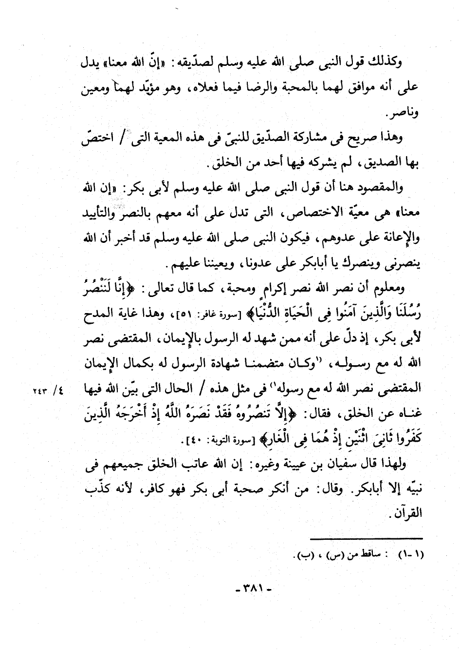 وَمَعْلُومٌ أَنَّ نَصْرَ اللَّهِ نَصْرُ إِكْرَامٍ وَمَحَبَّةٍ، كَمَا قَالَ تَعَالَى: {إِنَّا لَنَنْصُرُ رُسُلَنَا وَالَّذِينَ آمَنُوا فِي الْحَيَاةِ الدُّنْيَا} [سُورَةُ غَافِرٍ: 51] وَهَذَا غَايَةُ الْمَدْحِ لِأَبِي بَكْرٍ؛ إِذْ دَلَّ عَلَى أَنَّهُ مِمَّنْ شَهِدَ لَهُ الرَّسُولُ بِالْإِيمَانِ الْمُقْتَضِي نَصْرَ اللَّهِ لَهُ مَعَ رَسُولِهِ (¬1) ، وَكَانَ مُتَضَمِّنًا شَهَادَةَ الرَّسُولِ لَهُ بِكَمَالِ الْإِيمَانِ الْمُقْتَضِي نَصْرَ اللَّهِ لَهُ مَعَ رَسُولِهِ (¬2) فِي مِثْلِ هَذِهِ الْحَالِ الَّتِي بَيَّنَ اللَّهُ فِيهَا غِنَاهُ عَنِ الْخَلْقِ فَقَالَ: {إِلَّا تَنْصُرُوهُ فَقَدْ نَصَرَهُ اللَّهُ إِذْ أَخْرَجَهُ الَّذِينَ كَفَرُوا ثَانِيَ اثْنَيْنِ إِذْ هُمَا فِي الْغَارِ} [سُورَةُ التَّوْبَةِ: 40] .