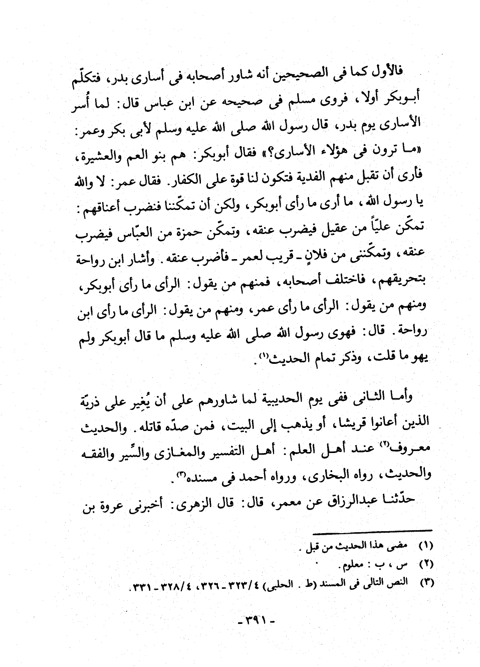 فَالْأَوَّلُ كَمَا فِي الصَّحِيحَيْنِ أَنَّهُ شَاوَرَ أَصْحَابَهُ فِي أُسَارَى بَدْرٍ فَتَكَلَّمَ أَبُو بَكْرٍ فَرَوَى مُسْلِمٌ فِي صَحِيحِهِ عَنِ ابْنِ عَبَّاسٍ قَالَ: «لَمَّا أُسِرَ الْأُسَارَى يَوْمَ بَدْرٍ، قَالَ رَسُولُ اللَّهِ - صَلَّى اللَّهُ عَلَيْهِ وَسَلَّمَ - لِأَبِي بَكْرٍ وَعُمَرَ: " مَا تَرَوْنَ فِي هَؤُلَاءِ الْأُسَارَى؟ " فَقَالَ أَبُو بَكْرٍ: هُمْ بَنُو الْعَمِّ وَالْعَشِيرَةِ، فَأَرَى أَنْ تُقْبَلَ مِنْهُمُ الْفِدْيَةُ فَتَكُونُ لَنَا قُوَّةً عَلَى الْكُفَّارِ فَقَالَ عُمَرُ: لَا وَاللَّهِ يَا رَسُولَ اللَّهِ مَا أَرَى مَا رَأَى أَبُو بَكْرٍ؛ وَلَكِنْ أَنْ تَمَكِّنَنَا فَنَضْرِبَ أَعْنَاقَهُمْ: تُمَكِّنَ عَلِيًّا مِنْ عَقِيلٍ فَيَضْرِبَ عُنُقَهُ، وَتُمْكِنَ حَمْزَةَ مِنَ الْعَبَّاسِ فَيَضْرِبَ عُنُقَهُ، وَتُمَكِّنَنِي مِنْ فُلَانٍ - قَرِيبٍ لِعُمَرَ - فَأَضْرِبَ عُنُقَهُ. وَأَشَارَ ابْنُ رَوَاحَةَ بِتَحْرِيفِهِمْ فَاخْتَلَفَ أَصْحَابُهُ، فَمِنْهُمْ مَنْ يَقُولُ: الرَّأْيُ مَا رَأَى أَبُو بَكْرٍ وَمِنْهُمْ مَنْ يَقُولُ: الرَّأْيُ مَا رَأَى عُمَرُ، وَمِنْهُمْ مَنْ يَقُولُ: الرَّأْيُ مَا رَأَى ابْنُ رَوَاحَةَ، قَالَ: فَهَوِيَ رَسُولُ اللَّهِ - صَلَّى اللَّهُ عَلَيْهِ وَسَلَّمَ - مَا قَالَ أَبُو بَكْرٍ وَلَمْ يَهْوَ مَا قُلْتُ» . وَذَكَرَ تَمَامَ الْحَدِيثِ (¬1) .