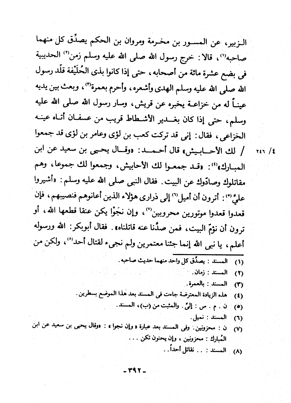 الزُّبَيْرِ عَنِ الْمِسْوَرِ بْنِ مَخْرَمَةَ وَمَرْوَانَ بْنِ الْحَكَمِ يُصَدِّقُ كُلٌّ مِنْهُمَا صَاحِبَهُ (¬1) ، قَالَا: «خَرَجَ رَسُولُ اللَّهِ - صَلَّى اللَّهُ عَلَيْهِ وَسَلَّمَ - زَمَنَ (¬2) الْحُدَيْبِيَةِ فِي بِضْعِ عَشْرَةِ مِائَةً مِنْ أَصْحَابِهِ حَتَّى إِذَا كَانُوا بِذِي الْحُلَيْفَةِ قَلَّدَ رَسُولُ اللَّهِ - صَلَّى اللَّهُ عَلَيْهِ وَسَلَّمَ - الْهَدْيَ وَأَشْعَرَهُ، وَأَحْرَمَ بِعُمْرَةٍ (¬3) وَبَعَثَ بَيْنَ يَدَيْهِ عَيْنًا لَهُ مِنْ خُزَاعَةَ يُخْبِرُهُ عَنْ قُرَيْشٍ، وَسَارَ رَسُولُ اللَّهِ - صَلَّى اللَّهُ عَلَيْهِ وَسَلَّمَ - حَتَّى إِذَا كَانَ بِغَدِيرِ الْأَشْطَاطِ قَرِيبًا مِنْ عُسْفَانَ أَتَاهُ عَيْنُهُ الْخُزَاعِيُّ؛ فَقَالَ: إِنِّي قَدْ تَرَكْتُ كَعْبَ بْنَ لُؤَيٍّ وَعَامِرَ بْنَ لُؤَيٍّ قَدْ جَمَعُوا لَكَ الْأَحَابِيشَ» "، قَالَ أَحْمَدُ: " وَقَالَ يَحْيَى بْنُ سَعِيدٍ عَنِ ابْنِ الْمُبَارَكِ " (¬4) : " «قَدْ جَمَعُوا لَكَ الْأَحَابِيشَ، وَجَمَعُوا لَكَ جُمُوعًا وَهُمْ مُقَاتِلُوكَ وَصَادُّوكَ عَنِ الْبَيْتِ؛ فَقَالَ النَّبِيُّ - صَلَّى اللَّهُ عَلَيْهِ وَسَلَّمَ -: " أَشِيرُوا عَلَيَّ (¬5) : أَتَرَوْنَ أَنْ أَمِيلَ (¬6) إِلَى ذَرَارِيِّ هَؤُلَاءِ الَّذِينَ أَعَانُوهُمْ فَنُصِيبَهُمْ؛ فَإِنْ قَعَدُوا قَعَدُوا مَوْتُورِينَ مَحْرُوبِينَ (¬7) ، وَإِنْ نَجَوْا يَكُنْ عُنُقًا قَطَعَهَا اللَّهُ، أَوْ تَرَوْنَ أَنْ نَؤُمَّ الْبَيْتَ، فَمَنْ صَدَّنَا عَنْهُ قَاتَلْنَاهُ فَقَالَ أَبُو بَكْرٍ: اللَّهُ وَرَسُولُهُ أَعْلَمُ يَا نَبِيَّ اللَّهِ؛ إِنَّمَا جِئْنَا مُعْتَمِرِينَ وَلَمْ نَجِئْ لِقِتَالِ أَحَدٍ (¬8) ، وَلَكِنْ مَنْ