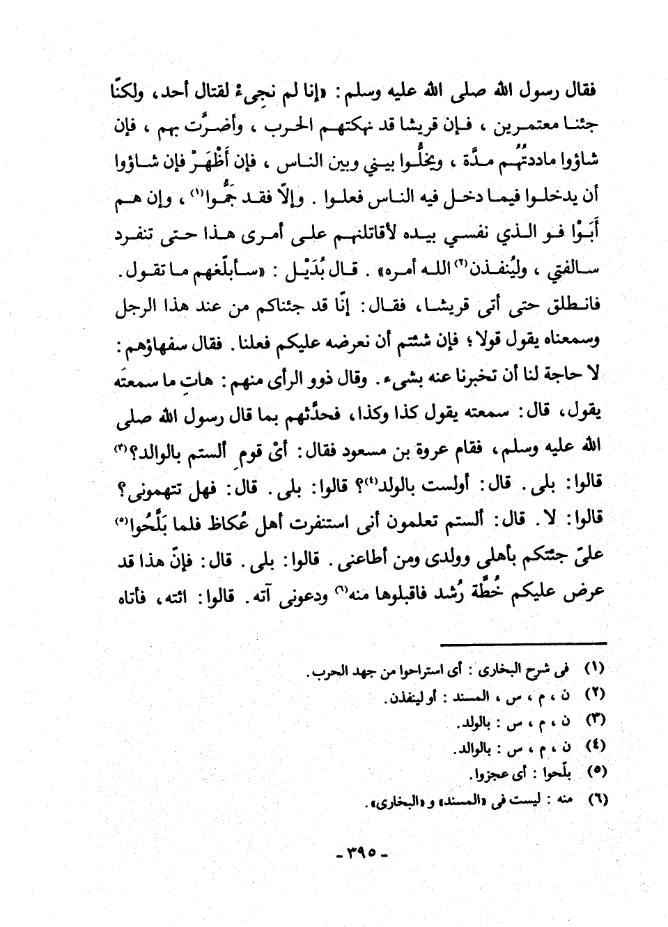 فَقَالَ رَسُولُ اللَّهِ - صَلَّى اللَّهُ عَلَيْهِ وَسَلَّمَ -: " إِنَّا لَمْ نَجِئْ لِقِتَالِ أَحَدٍ، وَلَكِنَّا جِئْنَا مُعْتَمِرِينَ؛ فَإِنَّ قُرَيْشًا قَدْ نَهِكَتْهُمُ الْحَرْبُ، وَأَضَرَّتْ بِهِمْ؛ فَإِنْ شَاءُوا مَادَدْتُهُمْ مُدَّةً وَيُخَلُّوا بَيْنِي وَبَيْنَ النَّاسِ؛ فَإِنْ أَظْهَرُ فَإِنْ شَاءُوا أَنْ يَدْخُلُوا فِيمَا دَخَلَ فِيهِ النَّاسُ فَعَلُوا وَإِلَّا فَقَدَ جَمُّوا (¬1) وَإِنْ هُمْ أَبَوْا فَوَالَّذِي نَفْسِي بِيَدِهِ لَأُقَاتِلَنَّهُمْ عَلَى أَمْرِي هَذَا حَتَّى تَنْفَرِدَ سَالِفَتِي وَلَيُنْفِذَنَّ (¬2) اللَّهُ أَمْرَهُ ". قَالَ بُدَيْلٌ: " سَأُبْلِغُهُمْ مَا تَقُولُ فَانْطَلَقَ حَتَّى أَتَى قُرَيْشًا؛ فَقَالَ: إِنَّا قَدْ جِئْنَاكُمْ مِنْ عِنْدِ هَذَا الرَّجُلِ وَسَمِعْنَاهُ يَقُولُ قَوْلًا؛ فَإِنْ شِئْتُمْ أَنْ نَعْرِضَهُ عَلَيْكُمْ فَعَلْنَا، فَقَالَ سُفَهَاؤُهُمْ: لَا حَاجَةَ لَنَا أَنْ تُخْبِرَنَا عَنْهُ بِشَيْءٍ، وَقَالَ ذَوُو الرَّأْيِ مِنْهُمْ: هَاتِ مَا سَمِعْتَهُ يَقُولُ، قَالَ سَمِعْتُهُ يَقُولُ: كَذَا وَكَذَا فَحَدَّثَهُمْ بِمَا قَالَ رَسُولُ اللَّهِ - صَلَّى اللَّهُ عَلَيْهِ وَسَلَّمَ - فَقَامَ عُرْوَةُ بْنُ مَسْعُودٍ، فَقَالَ: أَيْ قَوْمِ أَلَسْتُمْ بِالْوَالِدِ؟ (¬3) قَالُوا: بَلَى، قَالَ: أَوَلَسْتُ بِالْوَلَدِ (¬4) ؟ ، قَالُوا: بَلَى، قَالَ: فَهَلْ تَتَّهِمُونِي؟ قَالُوا: لَا، قَالَ: أَلَسْتُمْ تَعْلَمُونَ أَنِّي اسْتَنْفَرْتُ أَهْلَ عُكَاظٍ فَلَمَّا بَلَّحُوا (¬5) عَلَيَّ جِئْتُكُمْ بِأَهْلِي وَوَلَدِي وَمَنْ أَطَاعَنِي؟ قَالُوا: بَلَى، قَالَ: فَإِنَّ هَذَا قَدْ عَرَضَ عَلَيْكُمْ خُطَّةَ رُشْدٍ فَاقْبَلُوهَا مِنْهُ (¬6) وَدَعُونِي آتِهِ، قَالُوا: ائْتِهِ، فَأَتَاهُ