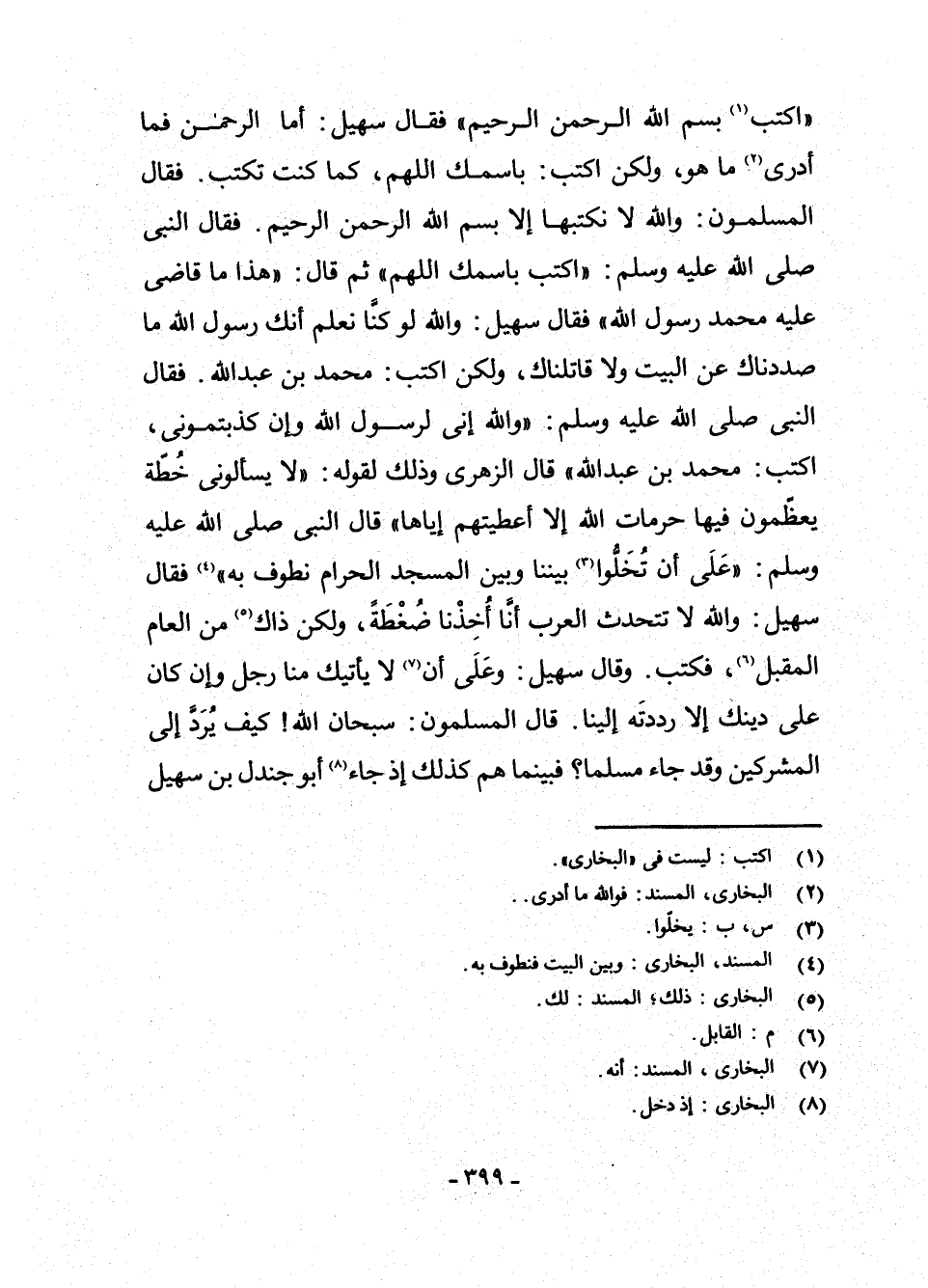 اكْتُبْ (¬1) بِسْمِ اللَّهِ الرَّحْمَنِ الرَّحِيمِ " فَقَالَ سُهَيْلٌ: أَمَّا الرَّحْمَنُ فَمَا أَدْرِي (¬2) مَا هُوَ، وَلَكِنِ اكْتُبْ: بِاسْمِكَ اللَّهُمَّ، كَمَا كُنْتَ تَكْتُبُ فَقَالَ الْمُسْلِمُونَ: وَاللَّهِ لَا نَكْتُبُهَا إِلَّا بِسْمِ اللَّهِ الرَّحْمَنِ الرَّحِيمِ؛ فَقَالَ النَّبِيُّ - صَلَّى اللَّهُ عَلَيْهِ وَسَلَّمَ -: " اكْتُبْ بِاسْمِكَ اللَّهُمَّ "، ثُمَّ قَالَ: " هَذَا مَا قَاضَى عَلَيْهِ مُحَمَّدٌ رَسُولُ اللَّهِ "؛ فَقَالَ سُهَيْلٌ: وَاللَّهِ لَوْ كُنَّا نَعْلَمُ أَنَّكَ رَسُولُ اللَّهِ مَا صَدَدْنَاكَ عَنِ الْبَيْتِ وَلَا قَاتَلْنَاكَ، وَلَكِنِ اكْتُبْ: مُحَمَّدُ بْنُ عَبْدِ اللَّهِ؛ فَقَالَ النَّبِيُّ - صَلَّى اللَّهُ عَلَيْهِ وَسَلَّمَ -: " وَاللَّهِ إِنِّي لَرَسُولُ اللَّهِ وَإِنْ كَذَّبْتُمُونِي؛ اكْتُبْ: مُحَمَّدُ بْنُ عَبْدِ اللَّهِ ". قَالَ الزُّهْرِيُّ: وَذَلِكَ لِقَوْلِهِ: " لَا يَسْأَلُونِي خُطَّةً يُعَظِّمُونَ فِيهَا حُرُمَاتِ اللَّهِ إِلَّا أَعْطَيْتُهُمْ إِيَّاهَا ". قَالَ النَّبِيُّ - صَلَّى اللَّهُ عَلَيْهِ وَسَلَّمَ -: " عَلَى أَنْ تُخَلُّوا (¬3) بَيْنَنَا وَبَيْنَ الْمَسْجِدِ الْحَرَامِ نَطُوفَ بِهِ " (¬4) ؛ فَقَالَ سُهَيْلٌ: وَاللَّهِ لَا تَتَحَدَّثُ الْعَرَبُ أَنَّا أُخِذْنَا ضَغْطَةً، وَلَكِنَّ ذَاكَ (¬5) مِنَ الْعَامِ الْمُقْبِلِ (¬6) فَكَتَبَ، وَقَالَ سُهَيْلٌ: وَعَلَى أَنْ (¬7) لَا يَأْتِيَكَ مِنَّا رَجُلٌ، وَإِنْ كَانَ عَلَى دِينِكَ إِلَّا رَدَدْتَهُ إِلَيْنَا قَالَ الْمُسْلِمُونَ: سُبْحَانَ اللَّهِ! كَيْفَ يُرَدُّ إِلَى الْمُشْرِكِينَ وَقَدْ جَاءَ مُسْلِمًا؟ فَبَيْنَمَا هُمْ كَذَلِكَ إِذْ جَاءَ (¬8) أَبُو جَنْدَلِ بْنُ سُهَيْلِ