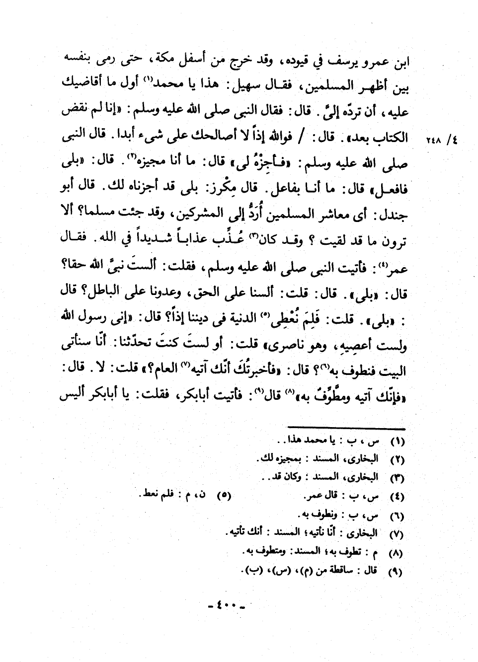 بْنِ عَمْرٍو يَرْسُفُ فِي قُيُودِهِ، وَقَدْ خَرَجَ مِنْ أَسْفَلِ مَكَّةَ حَتَّى رَمَى بِنَفْسِهِ بَيْنَ أَظْهُرِ الْمُسْلِمِينَ؛ فَقَالَ سُهَيْلٌ: هَذَا يَا مُحَمَّدُ (¬1) أَوَّلُ مَا أُقَاضِيكَ عَلَيْهِ أَنْ تَرُدَّهُ إِلَيَّ؛ قَالَ: فَقَالَ النَّبِيُّ - صَلَّى اللَّهُ عَلَيْهِ وَسَلَّمَ -: " إِنَّا لَمْ نَقْضِ الْكِتَابَ بَعْدُ قَالَ: فَوَاللَّهِ إِذًا لَا أُصَالِحُكَ عَلَى شَيْءٍ أَبَدًا؛ قَالَ النَّبِيُّ - صَلَّى اللَّهُ عَلَيْهِ وَسَلَّمَ -: " فَأَجِزْهُ لِي " قَالَ: مَا أَنَا مُجِيزُهُ (¬2) ، قَالَ: " بَلَى فَافْعَلْ " قَالَ: مَا أَنَا بِفَاعِلٍ؛ قَالَ مِكْرَزٌ: بَلَى قَدْ أَجَزْنَاهُ لَكَ، قَالَ أَبُو جَنْدَلٍ: أَيْ مَعَاشِرَ الْمُسْلِمِينَ أُرَدُّ إِلَى الْمُشْرِكِينَ وَقَدْ جِئْتُ مُسْلِمًا أَلَا تَرَوْنَ مَا قَدْ لَقِيتُ، وَقَدْ كَانَ (¬3) عُذِّبَ عَذَابًا شَدِيدًا فِي اللَّهِ فَقَالَ عُمَرُ (¬4) : فَأَتَيْتُ النَّبِيَّ - صَلَّى اللَّهُ عَلَيْهِ وَسَلَّمَ - فَقُلْتُ أَلَسْتَ نَبِيَّ اللَّهِ حَقًّا؟ قَالَ: بَلَى، قَالَ: قُلْتُ: أَلَسْنَا عَلَى الْحَقِّ وَعَدُوُّنَا عَلَى الْبَاطِلِ؟ قَالَ: بَلَى، قُلْتُ: فَلِمَ نُعْطِي (¬5) الدَّنِيَّةَ فِي دِينِنَا إِذًا؟ قَالَ: " إِنِّي رَسُولُ اللَّهِ وَلَسْتُ أَعْصِيهِ، وَهُوَ نَاصِرِي "؛ قُلْتُ: أَوَلَسْتَ كُنْتَ تُحَدِّثُنَا: أَنَّا سَنَأْتِي الْبَيْتَ فَنَطُوفُ بِهِ (¬6) ؟ قَالَ: " فَأَخْبَرْتُكَ أَنَّكَ آتِيهِ (¬7) الْعَامَ؟ " قُلْتُ: لَا، قَالَ: " فَإِنَّكَ آتِيهِ وَمُطَّوِّفٌ بِهِ " (¬8) قَالَ (¬9) : فَأَتَيْتُ أَبَا بَكْرٍ فَقُلْتُ: يَا أَبَا بَكْرٍ: أَلَيْسَ
