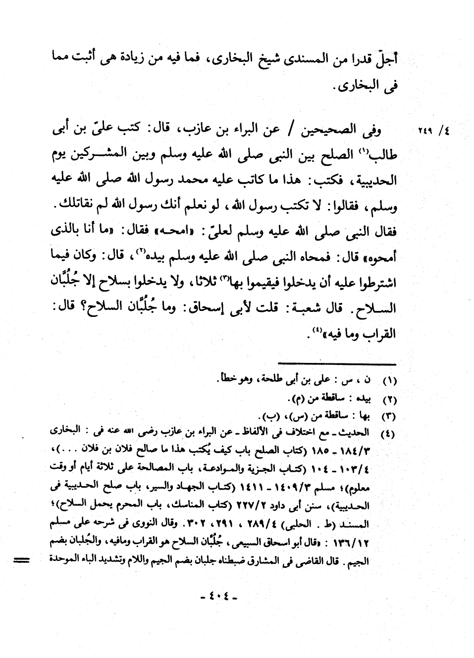(¬4) الْحَدِيثُ مَعَ اخْتِلَافٍ فِي الْأَلْفَاظِ - عَنِ الْبَرَاءِ بْنِ عَازِبٍ - رَضِيَ اللَّهُ عَنْهُ - فِي " الْبُخَارِيِّ 3/184 - 185 (كِتَابُ الصُّلْحِ بَابُ كَيْفَ يَكْتُبُ هَذَا مَا صَالَحَ فُلَانُ بْنُ فُلَانٍ. .) \ 4 103 - 104 (كِتَابُ الْجِزْيَةِ وَالْمُوَادَعَةِ، بَابُ الْمُصَالَحَةِ عَلَى ثَلَاثَةِ أَيَّامٍ أَوْ وَقْتٍ مَعْلُومٍ، مُسْلِمٍ 3/1409 - 1411 (كِتَابُ الْجِهَادِ وَالسِّيَرِ، بَابُ صُلْحِ الْحُدَيْبِيَةِ فِي الْحُدَيْبِيَةِ) سُنَنِ أَبِي دَاوُدَ 2/227 (كِتَابُ الْمَنَاسِكِ، بَابُ الْمُحْرِمِ يَحْمِلُ السِّلَاحَ) ، الْمُسْنَدِ (ط. الْحَلَبِيِّ) 4/289، 291، 302. وَقَالَ النَّوَوِيُّ فِي شَرْحِهِ عَلَى مُسْلِمٍ 12/136: وَقَالَ أَبُو إِسْحَاقَ السَّبِيعِيُّ، جُلُبَّانُ السِّلَاحِ هُوَ الْقِرَابُ وَمَا فِيهِ، وَالْجُلُبَّانُ بِضَمِّ الْجِيمِ. قَالَ الْقَاضِي فِي الْمَشَارِقِ ضَبَطْنَاهُ (جُلُبَّانُ) بِضَمِّ الْجِيمِ وَاللَّامِ وَتَشْدِيدِ الْبَاءِ الْمُوَحَّدَةِ قَالَ: وَكَذَا رَوَاهُ الْأَكْثَرُونَ، وَصَوَّبَهُ ابْنُ قُتَيْبَةَ وَغَيْرُهُ، وَرَوَاهُ بَعْضُهُمْ بِإِسْكَانِ اللَّامِ وَكَذَا ذَكَرَهُ الْهَرَوِيُّ وَصَوَّبَهُ هُوَ وَثَابِتٌ، وَلَمْ يَذْكُرْ ثَابِتٌ سِوَاهُ، وَهُوَ أَلْطَفُ مِنَ الْجِرَابِ يَكُونُ مِنَ الْأُدْمِ يُوضَعُ فِيهِ السَّيْفُ مُغْمَدًا وَيَطْرَحُ فِيهِ الرَّاكِبُ سَوْطَهُ وَأَدَوَاتِهِ وَيُعَلِّقُهُ فِي الرَّحْلِ. قَالَ الْعُلَمَاءُ: وَإِنَّمَا شَرَطُوا هَذَا لِوَجْهَيْنِ أَحَدُهُمَا أَنْ لَا يَظْهَرَ مِنْهُ دُخُولُ الْغَالِبِينَ الْقَاهِرِينَ وَالثَّانِي أَنَّهُ إِنْ عَرَضَ فِتْنَةٌ أَوْ نَحْوُهَا يَكُونُ فِي الِاسْتِعْدَادِ بِالسِّلَاحِ صُعُوبَةٌ. "