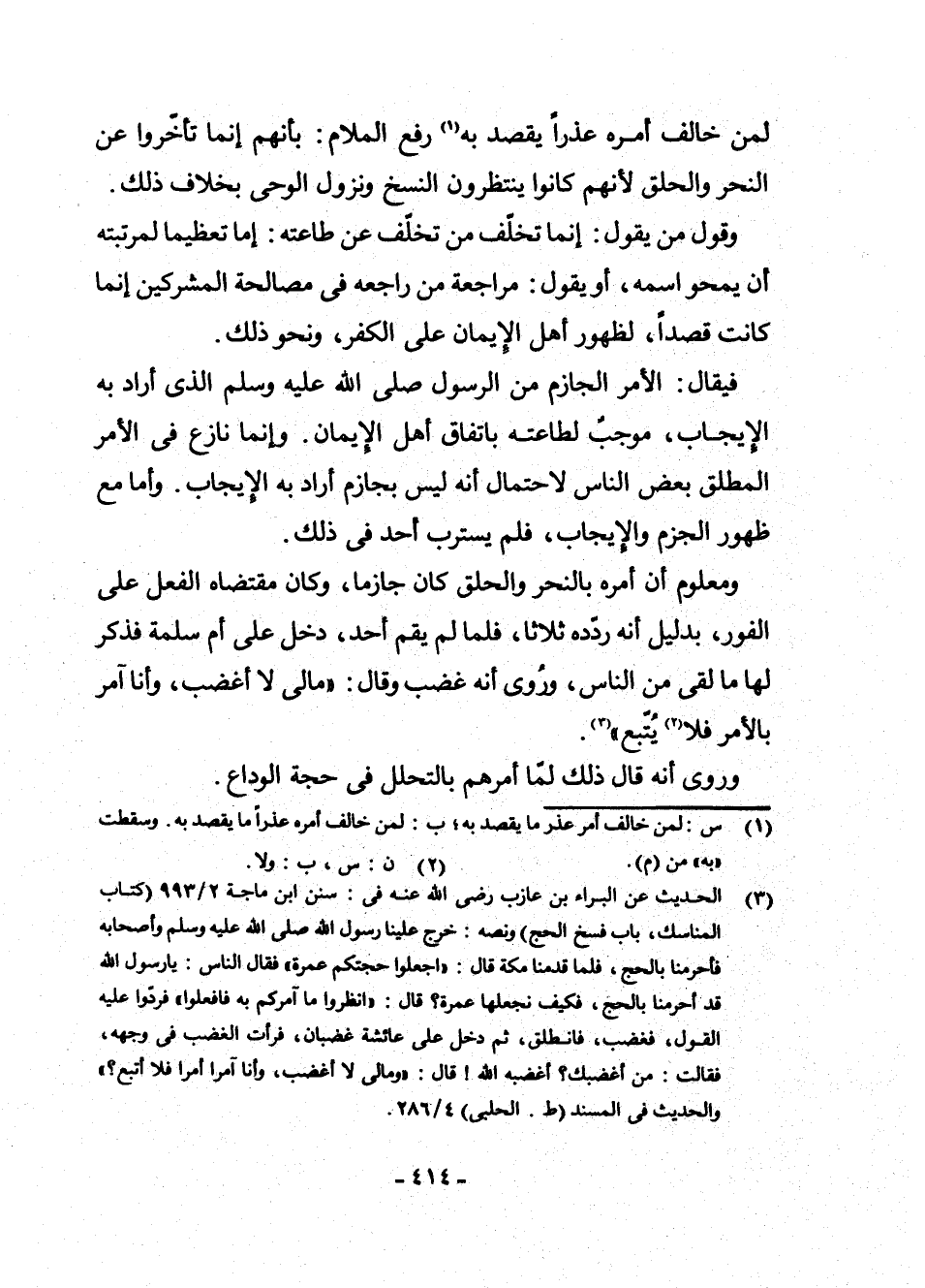(¬3) الْحَدِيثُ عَنِ الْبَرَاءِ بْنِ عَازِبٍ - رَضِيَ اللَّهُ عَنْهُ - فِي: سُنَنِ ابْنِ مَاجَهْ 2/993 (كِتَابُ الْمَنَاسِكِ، بَابُ فَسْخِ الْحَجِّ) وَنَصُّهُ: خَرَجَ عَلَيْنَا رَسُولُ اللَّهِ - صَلَّى اللَّهُ عَلَيْهِ وَسَلَّمَ - وَأَصْحَابُهُ فَأَحْرَمْنَا بِالْحَجِّ؛ فَلَمَّا قَدِمْنَا مَكَّةَ قَالَ: " اجْعَلُوا حَجَّتَكُمْ عُمْرَةً " فَقَالَ النَّاسُ: يَا رَسُولَ اللَّهِ، قَدْ أَحْرَمْنَا بِالْحَجِّ. فَكَيْفَ نَجْعَلُهَا عُمْرَةً؟ قَالَ: " انْظُرُوا مَا آمُرُكُمْ بِهِ فَافْعَلُوا " فَرَدُّوا عَلَيْهِ الْقَوْلَ؛ فَغَضِبَ، فَانْطَلَقَ، ثُمَّ دَخَلَ عَلَى عَائِشَةَ غَضْبَانَ، فَرَأَتِ الْغَضَبَ فِي وَجْهِهِ، فَقَالَتْ: مَنْ أَغْضَبَكَ؟ أَغْضَبَهُ اللَّهُ! قَالَ: " وَمَالِي لَا أَغْضَبُ، وَأَنَا آمِرٌ أَمْرًا فَلَا أُتَّبَعُ؟ " وَالْحَدِيثُ فِي الْمُسْنَدِ (ط. الْحَلَبِيِّ) \ 4 286.