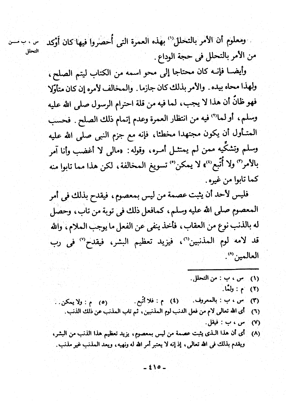 (¬8) أَيْ أَنَّ هَذَا الَّذِي يُثْبِتُ عِصْمَةَ مَنْ لَيْسَ بِمَعْصُومٍ، يَزِيدُ تَعْظِيمَ هَذَا الذَّنْبِ مِنَ الْبَشَرِ، وَيُقَدِّمُ بِذَلِكَ فِي اللَّهِ تَعَالَى؛ إِذْ إِنَّهُ لَا يَعْتَبِرُ أَمْرَ اللَّهِ لَهُ وَنَهْيَهُ، وَيَعُدُّ الْمُذْنِبَ غَيْرَ مُذْنِبٍ.