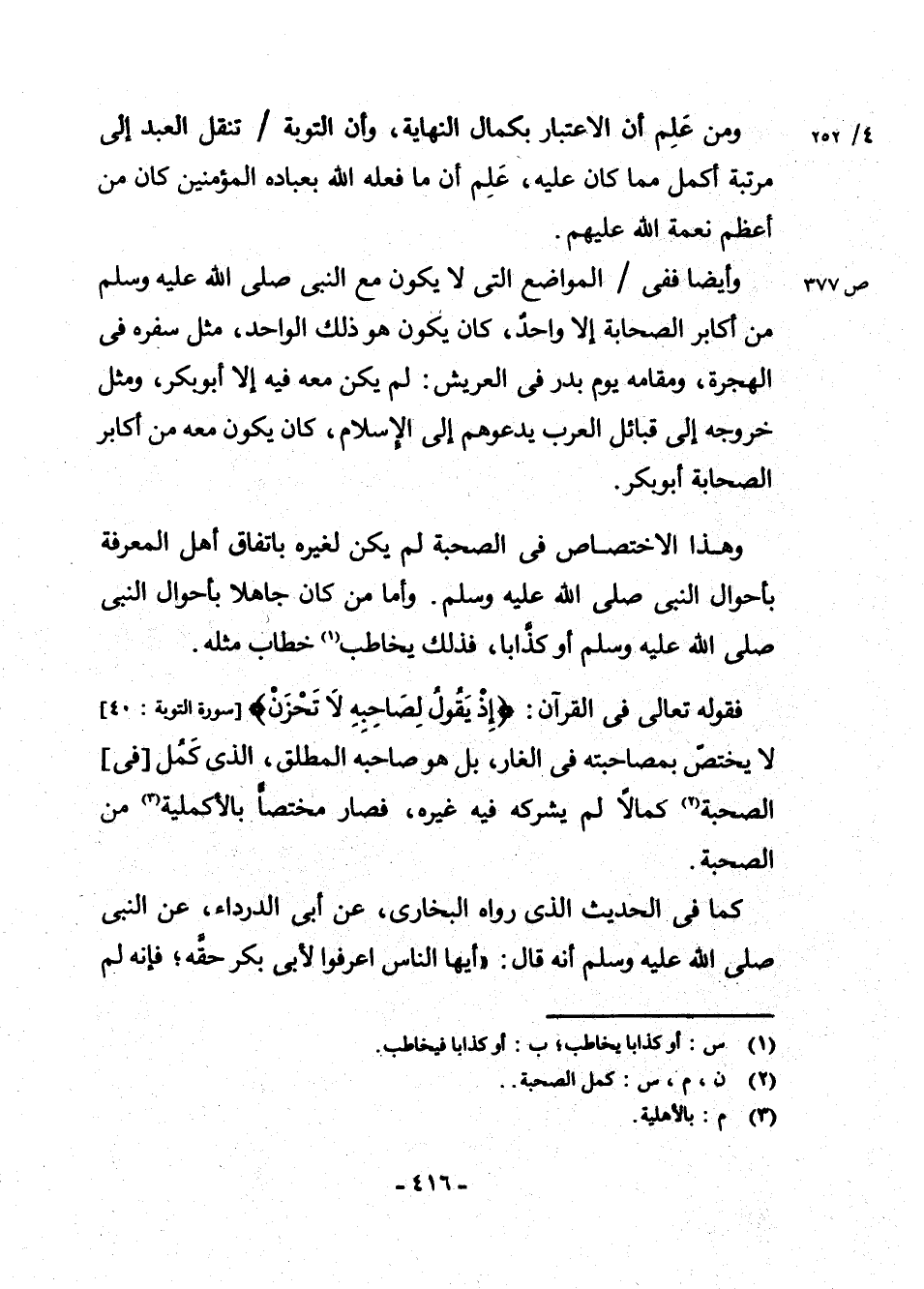 فَقَوْلُهُ تَعَالَى فِي الْقُرْآنِ: {إِذْ يَقُولُ لِصَاحِبِهِ لَا تَحْزَنْ} [سُورَةُ التَّوْبَةِ: 40] لَا يَخْتَصُّ بِمُصَاحَبَتِهِ فِي الْغَارِ، بَلْ هُوَ صَاحِبُهُ الْمُطْلَقُ الَّذِي كَمُلَ [فِي] الصُّحْبَةِ (¬2) كَمَالًا لَمْ يَشْرَكْهُ فِيهِ غَيْرُهُ، فَصَارَ مُخْتَصًّا بِالْأَكْمَلِيَّةِ (¬3) مِنَ الصُّحْبَةِ.