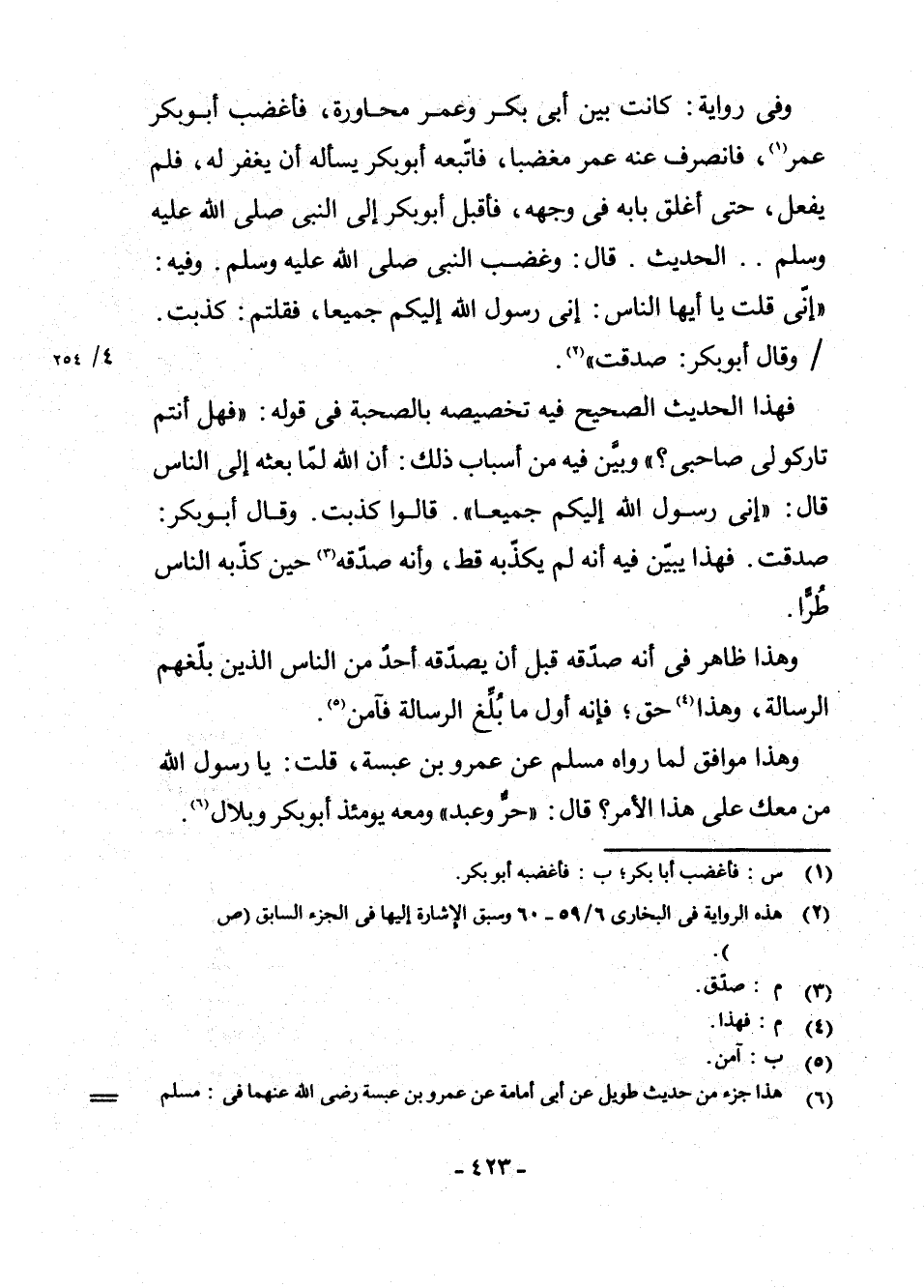 (¬6) هَذَا جُزْءٌ مِنْ حَدِيثٍ طَوِيلٍ عَنْ أَبِي أُمَامَةَ عَنْ عَمْرِو بْنِ عَبَسَةَ - رَضِيَ اللَّهُ عَنْهُمَا - فِي: مُسْلِمٍ 1/569 (كِتَابُ صَلَاةِ الْمُسَافِرِينَ وَقَصْرِهَا، بَابُ إِسْلَامِ عَمْرِو بْنِ عَبَسَةَ) وَأَوَّلُهُ. . . عَنْ أَبِي أُمَامَةَ قَالَ عَمْرُو بْنُ عَبَسَةَ السُّلَمِيُّ: وَكُنْتُ وَأَنَا فِي الْجَاهِلِيَّةِ أَظُنُّ أَنَّ النَّاسَ عَلَى ضَلَالَةٍ. . الْحَدِيثَ وَفِيهِ: قُلْتُ لَهُ: مَا أَنْتَ؟ قَالَ: " أَنَا نَبِيٌّ ". . وَفِيهِ قُلْتُ لَهُ: فَمَنْ مَعَكَ عَلَى هَذَا؟ قَالَ: " حُرٌّ وَعَبْدٌ " (قَالَ: وَمَعَهُ يَوْمَئِذٌ أَبُو بَكْرٍ وَبِلَالٌ مِمَّنْ آمَنَ مَعَهُ. . . وَالْحَدِيثُ أَيْضًا فِي: سُنَنِ النَّسَائِيِّ 1/283 - 284 (كِتَابُ مَوَاقِيتِ الصَّلَاةِ، بَابُ إِبَاحَةِ الصَّلَاةِ إِلَى أَنْ يُصَلِّيَ الصُّبْحَ) سُنَنِ ابْنِ مَاجَهْ 1/434 (كِتَابُ إِقَامَةِ الصَّلَاةِ، بَابُ مَا جَاءَ فِي أَيِّ سَاعَاتِ اللَّيْلِ أَفْضَلُ) ، الْمُسْنَدِ (ط. الْحَلَبِيِّ) 4/111 - 113، 113 - 114.