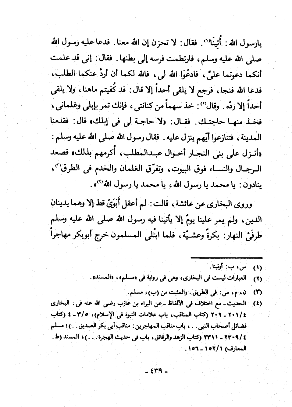 (¬4) الْحَدِيثُ - مَعَ اخْتِلَافٍ فِي الْأَلْفَاظِ - عَنِ الْبَرَاءِ بْنِ عَازِبٍ - رَضِيَ اللَّهُ عَنْهُ - فِي " الْبُخَارِيِّ 4/201 - 202 (كِتَابُ الْمَنَاقِبِ، بَابُ عَلَامَاتِ النُّبُوَّةِ فِي الْإِسْلَامِ) ، 5/3 - 4 (كِتَابُ فَضَائِلِ أَصْحَابِ النَّبِيِّ. . . بَابُ مَنَاقِبِ الْمُهَاجِرِينَ: مَنَاقِبُ أَبِي بَكْرٍ الصِّدِّيقِ. . .) مُسْلِمٍ 4/2309 - 2311 (كِتَابُ الزُّهْدِ وَالرَّقَائِقِ، بَابٌ فِي حَدِيثِ الْهِجْرَةِ. . .) الْمُسْنَدِ (ط. الْمَعَارِفِ) 1/152 - 156.