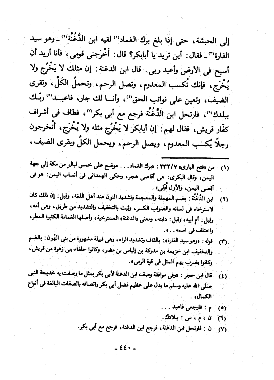 (¬7) ن: فَارْتَحَلَ ابْنُ الدَّغِنَةِ، فَرَجَعَ ابْنُ الدَّغِنَةِ، فَرَجَعَ مَعَ أَبِي بَكْرٍ.