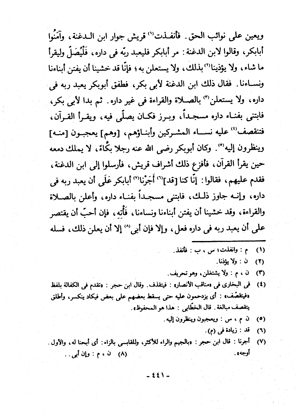 وَيُعِينُ عَلَى نَوَائِبِ الْحَقِّ، فَأَنْفَذَتْ (¬1) قُرَيْشٌ جِوَارَ ابْنِ الدَّغِنَةِ، وَآمَنُوا أَبَا بَكْرٍ وَقَالُوا لِابْنِ الدَّغِنَةِ: مُرْ أَبَا بَكْرٍ فَلْيَعْبُدْ رَبَّهُ فِي دَارِهِ، فَلْيُصَلِّ وَلْيَقْرَأْ مَا شَاءَ، وَلَا يُؤْذِينَا (¬2) بِذَلِكَ، وَلَا يَسْتَعْلِنَّ بِهِ، فَإِنَّا قَدْ خَشِينَا أَنْ يَفْتِنَ أَبْنَاءَنَا وَنِسَاءَنَا، فَقَالَ ذَلِكَ ابْنُ الدَّغِنَةِ لِأَبِي بَكْرٍ، فَطَفِقَ أَبُو بَكْرٍ يَعْبُدُ رَبَّهُ فِي دَارِهِ وَلَا يَسْتَعْلِنَّ (¬3) بِالصَّلَاةِ وَالْقِرَاءَةِ فِي غَيْرِ دَارِهِ. ثُمَّ بَدَا لِأَبِي بَكْرٍ فَابْتَنَى بِفِنَاءِ دَارِهِ مَسْجِدًا، وَبَرَزَ فَكَانَ يُصَلِّي فِيهِ، وَيَقْرَأُ الْقُرْآنَ فَتَنْقَصِفُ (¬4) عَلَيْهِ نِسَاءُ الْمُشْرِكِينَ وَأَبْنَاؤُهُمْ، [وَهُمْ] يَعْجَبُونَ [مِنْهُ] وَيَنْظُرُونَ إِلَيْهِ (¬5) ، وَكَانَ أَبُو بَكْرٍ - رَضِيَ اللَّهُ عَنْهُ - رَجُلًا بَكَّاءً لَا يَمْلِكُ دَمْعَهُ حِينَ يَقْرَأُ الْقُرْآنَ فَأَفْزَعَ ذَلِكَ أَشْرَافَ قُرَيْشٍ، فَأَرْسَلُوا إِلَى ابْنِ الدَّغِنَةِ فَقَدِمَ عَلَيْهِمْ؛ فَقَالُوا: إِنَّا كُنَّا [قَدْ] (¬6) أَجَرْنَا (¬7) أَبَا بَكْرٍ عَلَى أَنْ يَعْبُدَ رَبَّهُ فِي دَارِهِ، وَإِنَّهُ جَاوَزَ ذَلِكَ، فَابْتَنَى مَسْجِدًا بِفِنَاءِ دَارِهِ، وَأَعْلَنَ بِالصَّلَاةِ وَالْقِرَاءَةِ، وَقَدْ خَشِينَا أَنْ يَفْتِنَ أَبْنَاءَنَا وَنِسَاءَنَا فَأْتِهِ، فَإِنْ أَحَبَّ أَنْ يَقْتَصِرَ عَلَى أَنْ يَعْبُدَ رَبَّهُ فِي دَارِهِ فَعَلَ، وَإِلَّا فَإِنْ أَبَى (¬8) إِلَّا أَنْ يُعْلِنَ ذَلِكَ، فَسَلْهُ