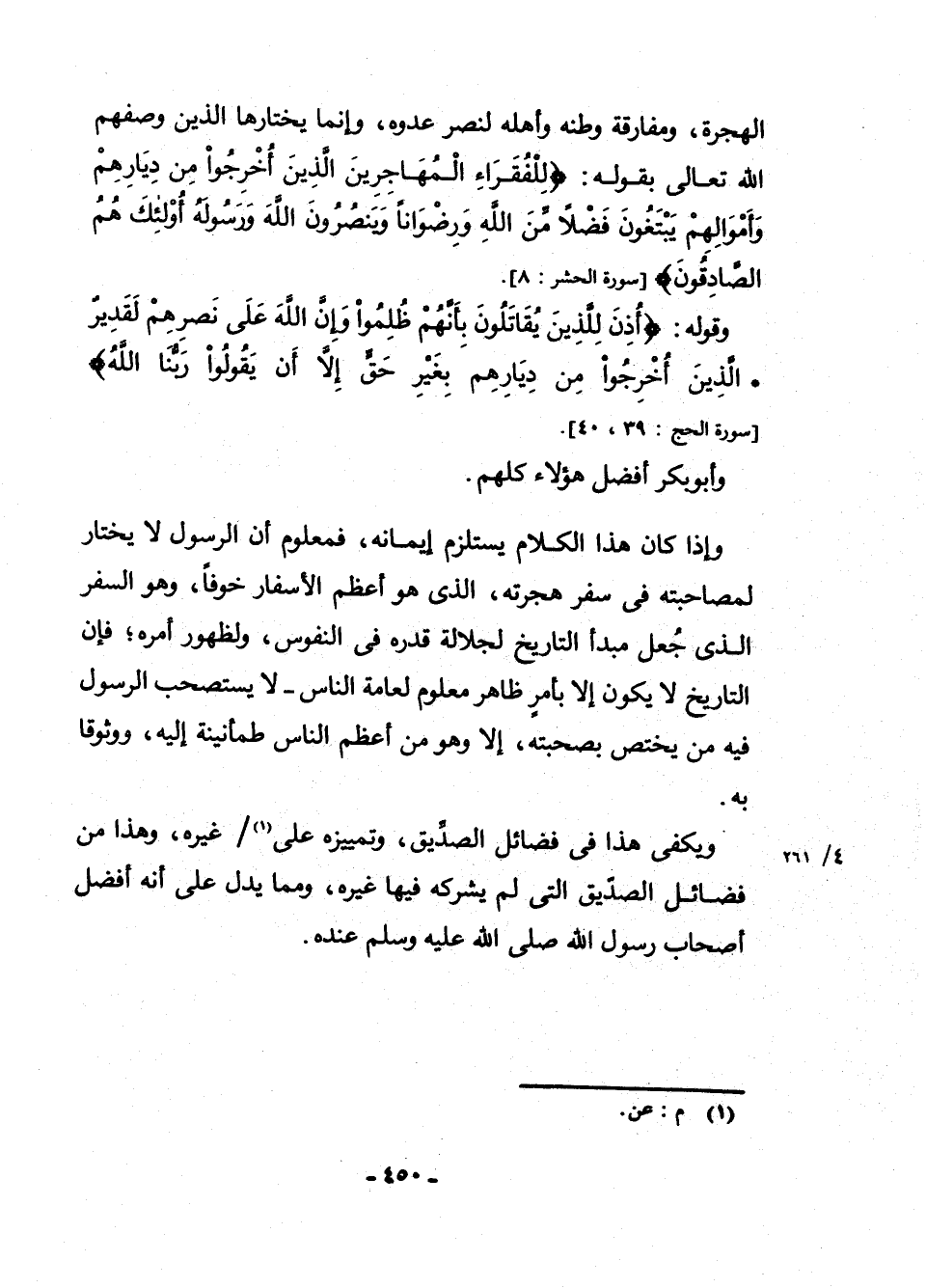 وَإِذَا كَانَ هَذَا الْكَلَامُ يَسْتَلْزِمُ إِيمَانَهُ فَمَعْلُومٌ أَنَّ الرَّسُولَ لَا يَخْتَارُ لِمُصَاحَبَتِهِ فِي سَفَرِ هِجْرَتِهِ الَّذِي هُوَ أَعْظَمُ الْأَسْفَارِ خَوْفًا، وَهُوَ السَّفَرُ الَّذِي جُعِلَ مَبْدَأَ التَّارِيخِ لِجَلَالَةِ قَدْرِهِ فِي النُّفُوسِ وَلِظُهُورِ أَمْرِهِ، فَإِنَّ التَّارِيخَ لَا يَكُونُ إِلَّا بِأَمْرٍ ظَاهِرٍ مَعْلُومٍ لِعَامَّةِ النَّاسِ لَا يَسْتَصْحِبُ الرَّسُولُ فِيهِ مَنْ يَخْتَصُّ بِصُحْبَتِهِ إِلَّا وَهُوَ مِنْ أَعْظَمِ النَّاسِ طُمَأْنِينَةً إِلَيْهِ وَوُثُوقًا بِهِ.