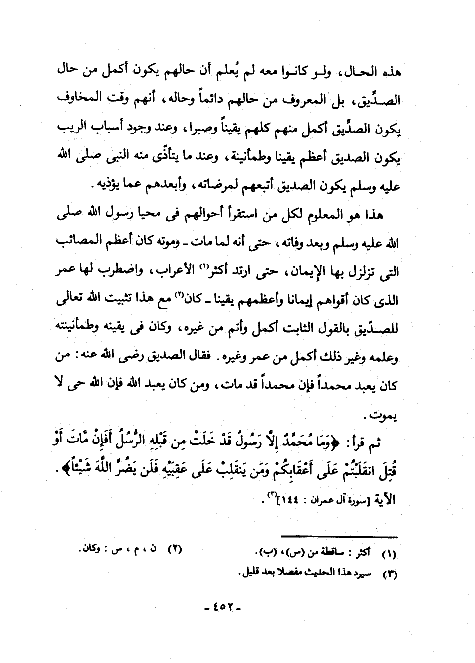 هَذَا هُوَ الْمَعْلُومُ لِكُلِّ مَنِ اسْتَقْرَأَ أَحْوَالَهُمْ فِي مَحْيَا رَسُولِ اللَّهِ صَلَّى اللَّهُ عَلَيْهِ وَسَلَّمَ وَبَعْدَ وَفَاتِهِ حَتَّى أَنَّهُ لَمَّا مَاتَ وَمَوْتُهُ كَانَ أَعْظَمَ الْمَصَائِبِ الَّتِي تَزَلْزَلَ بِهَا الْإِيمَانُ، حَتَّى ارْتَدَّ أَكْثَرُ (¬1) الْأَعْرَابِ، وَاضْطَرَبَ لَهَا عُمَرُ الَّذِي كَانَ أَقْوَاهُمْ إِيمَانًا وَأَعْظَمَهُمْ يَقِينًا كَانَ (¬2) مَعَ هَذَا تَثْبِيتُ اللَّهِ تَعَالَى لِلصِّدِّيقِ بِالْقَوْلِ الثَّابِتِ أَكْمَلَ وَأَتَمَّ مِنْ غَيْرِهِ، وَكَانَ فِي يَقِينِهِ وَطُمَأْنِينَتِهِ وَعِلْمِهِ وَغَيْرِ ذَلِكَ أَكْمَلَ مِنْ عُمَرَ وَغَيْرِهِ فَقَالَ الصِّدِّيقُ رَضِيَ اللَّهُ عَنْهُ: مَنْ كَانَ يَعْبُدُ مُحَمَّدًا فَإِنَّ مُحَمَّدًا قَدْ مَاتَ، وَمَنْ كَانَ يَعْبُدُ اللَّهَ، فَإِنَّ اللَّهَ حَيٌّ لَا يَمُوتُ.