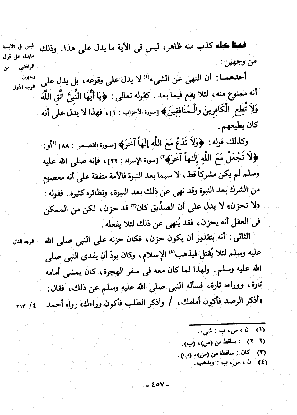 وَكَذَلِكَ قَوْلُهُ: {وَلَا تَدْعُ مَعَ اللَّهِ إِلَهًا آخَرَ} [سُورَةُ الْقَصَصِ: 88] ، (2 أَوْ {لَا تَجْعَلْ مَعَ اللَّهِ إِلَهًا آخَرَ} 2) (¬2) [سُورَةُ الْإِسْرَاءِ: 22] فَإِنَّهُ صَلَّى اللَّهُ عَلَيْهِ وَسَلَّمَ لَمْ يَكُنْ مُشْرِكًا قَطُّ لَا سِيَّمَا بَعْدَ النُّبُوَّةِ فَالْأُمَّةُ مُتَّفِقَةٌ عَلَى أَنَّهُ مَعْصُومٌ مِنَ الشِّرْكِ بَعْدَ النُّبُوَّةِ، وَقَدْ نُهِيَ عَنْ ذَلِكَ بَعْدَ النُّبُوَّةِ وَنَظَائِرُهُ كَثِيرَةٌ فَقَوْلُهُ لَا تَحْزَنْ لَا يَدُلُّ عَلَى أَنَّ الصِّدِّيقَ كَانَ (¬3) قَدْ حَزِنَ، لَكِنْ مِنَ الْمُمْكِنِ فِي الْعَقْلِ أَنَّهُ يَحْزَنُ فَقَدْ يُنْهَى عَنْ ذَلِكَ لِئَلَّا يَفْعَلَهُ.