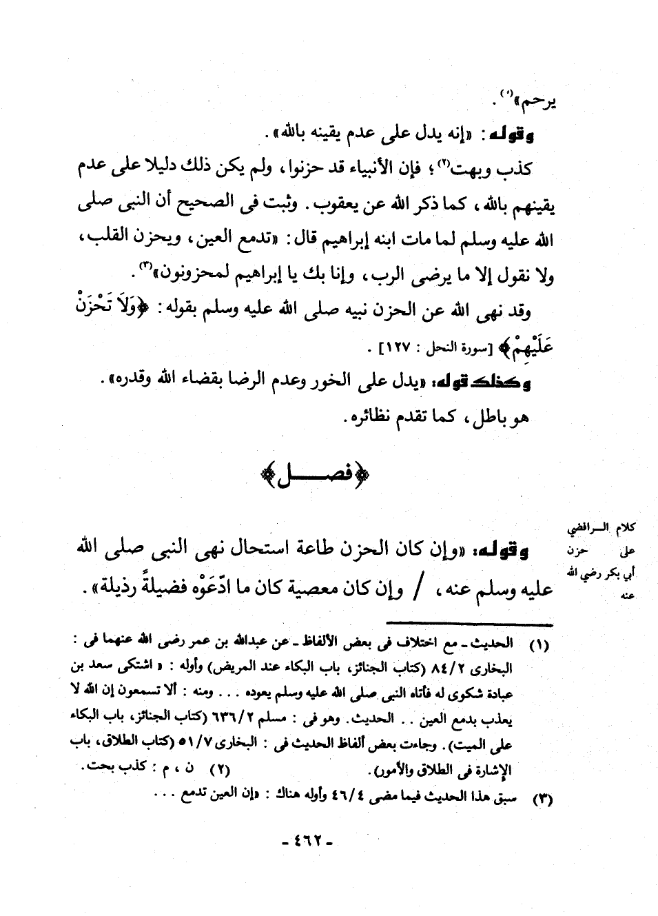 وَقَوْلُهُ: " وَإِنْ كَانَ الْحُزْنُ طَاعَةً اسْتَحَالَ نَهْيُ النَّبِيِّ صَلَّى اللَّهُ عَلَيْهِ وَسَلَّمَ عَنْهُ، وَإِنْ كَانَ مَعْصِيَةً كَانَ مَا ادَّعَوْهُ فَضِيلَةً رَذِيلَةً ".