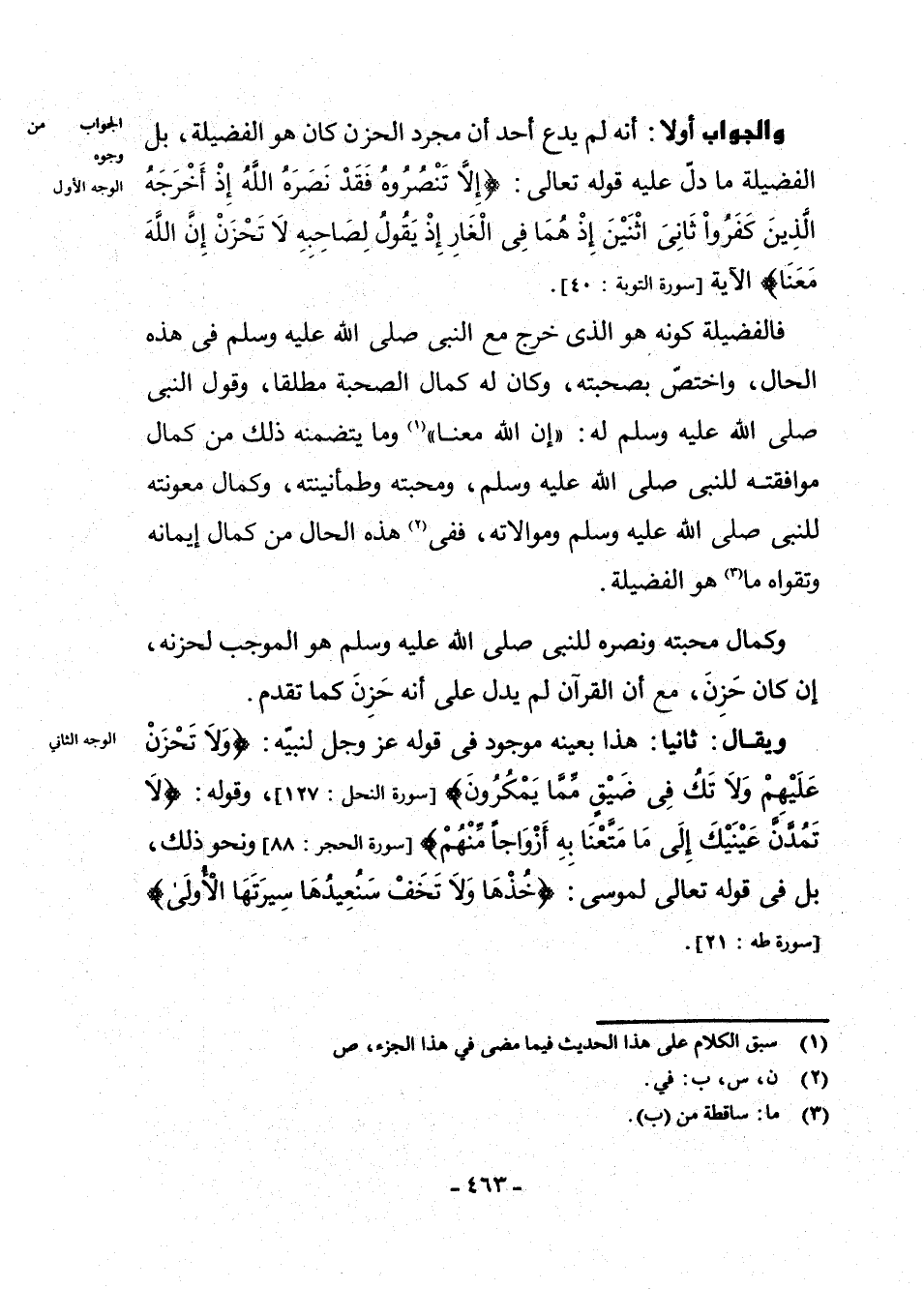 وَالْجَوَابُ أَوَّلًا: أَنَّهُ لَمْ يَدَّعِ أَحَدٌ أَنَّ مُجَرَّدَ الْحُزْنِ كَانَ هُوَ الْفَضِيلَةَ، بَلِ الْفَضِيلَةُ مَا دَلَّ عَلَيْهِ قَوْلُهُ تَعَالَى: {إِلَّا تَنْصُرُوهُ فَقَدْ نَصَرَهُ اللَّهُ إِذْ أَخْرَجَهُ الَّذِينَ كَفَرُوا ثَانِيَ اثْنَيْنِ إِذْ هُمَا فِي الْغَارِ إِذْ يَقُولُ لِصَاحِبِهِ لَا تَحْزَنْ إِنَّ اللَّهَ مَعَنَا} الْآيَةَ [سُورَةُ التَّوْبَةِ: 40] .