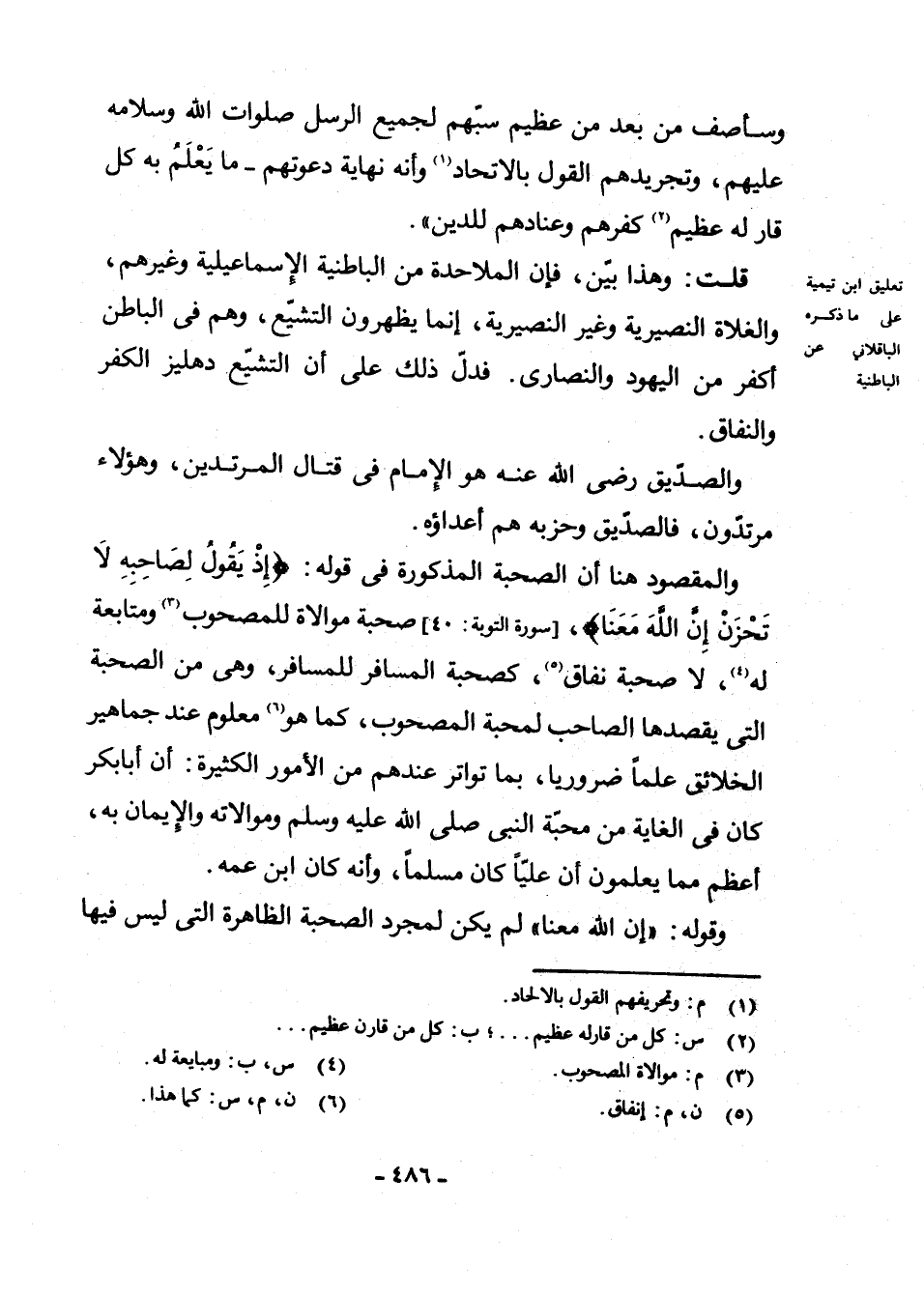 وَالْمَقْصُودُ هُنَا أَنَّ الصُّحْبَةَ الْمَذْكُورَةَ فِي قَوْلِهِ: {إِذْ يَقُولُ لِصَاحِبِهِ لَا تَحْزَنْ إِنَّ اللَّهَ مَعَنَا} [سُورَةُ التَّوْبَةِ: 40] صُحْبَةُ مُوَالَاةٍ لِلْمَصْحُوبِ (¬3) وَمُتَابَعَةٍ لَهُ (¬4) لَا صُحْبَةُ نِفَاقٍ (¬5) كَصُحْبَةِ الْمُسَافِرِ لِلْمُسَافِرِ، وَهِيَ مِنَ الصُّحْبَةِ الَّتِي يَقْصِدُهَا الصَّاحِبُ لِمَحَبَّةِ الْمَصْحُوبِ كَمَا هُوَ (¬6) مَعْلُومٌ عِنْدَ جَمَاهِيرِ الْخَلَائِقِ عِلْمًا ضَرُورِيًّا بِمَا تَوَاتَرَ عِنْدَهُمْ مِنَ الْأُمُورِ الْكَثِيرَةِ أَنَّ أَبَا بَكْرٍ كَانَ فِي الْغَايَةِ مِنْ مَحَبَّةِ النَّبِيِّ صَلَّى اللَّهُ عَلَيْهِ وَسَلَّمَ وَمُوَالَاتِهِ وَالْإِيمَانِ بِهِ أَعْظَمُ مِمَّا يَعْلَمُونَ أَنَّ عَلِيًّا كَانَ مُسْلِمًا، وَأَنَّهُ كَانَ ابْنُ عَمِّهِ.