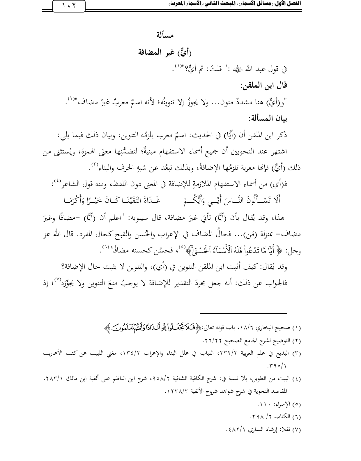 وقد يُقال: كيف أثبت ابن الملقن التنوين في (أي)، والتنوين لا يثبت حال الإضافة؟