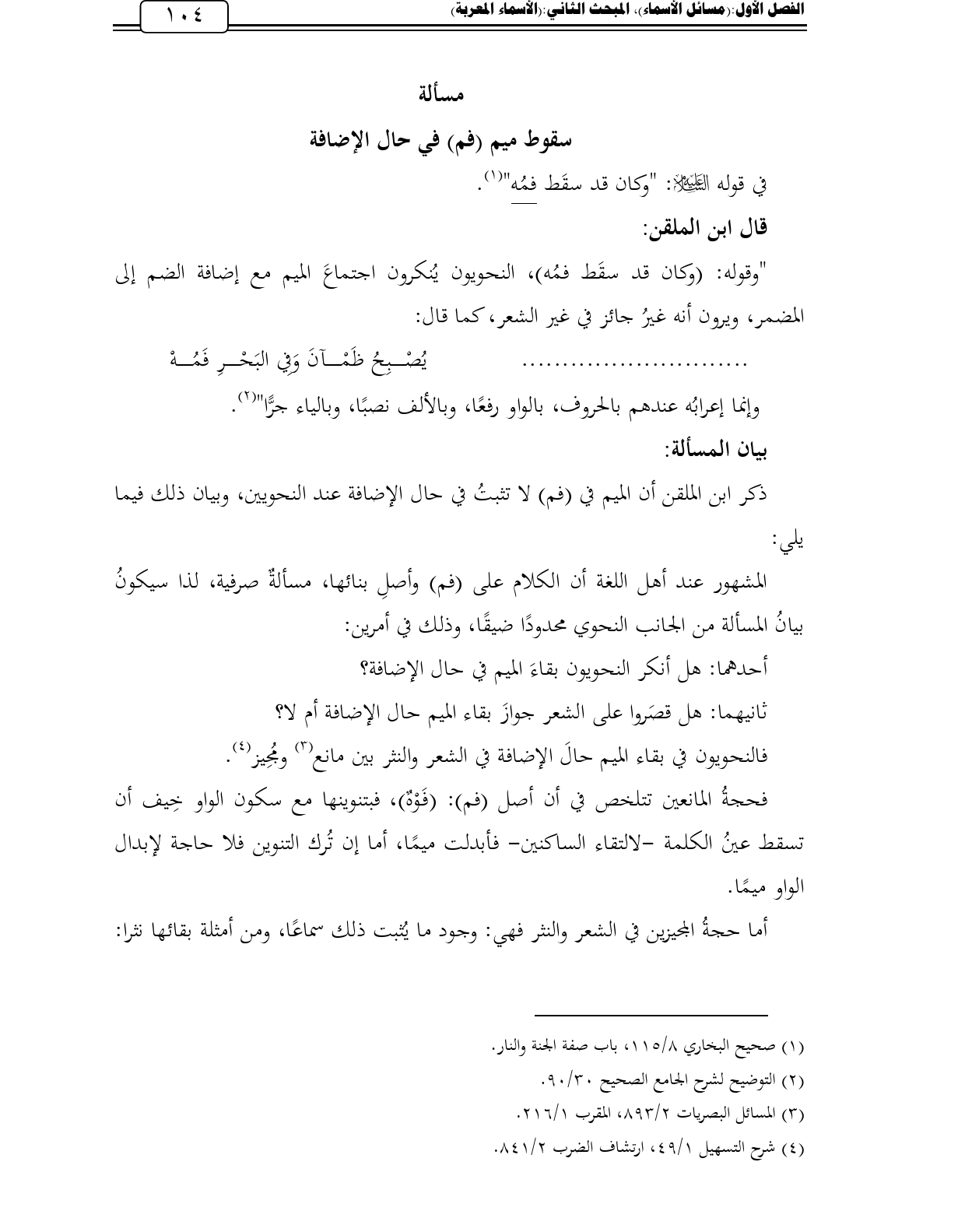 ذكر ابن الملقن أن الميم في (فم) لا تثبتُ في حال الإضافة عند النحويين، وبيان ذلك فيما يلي: