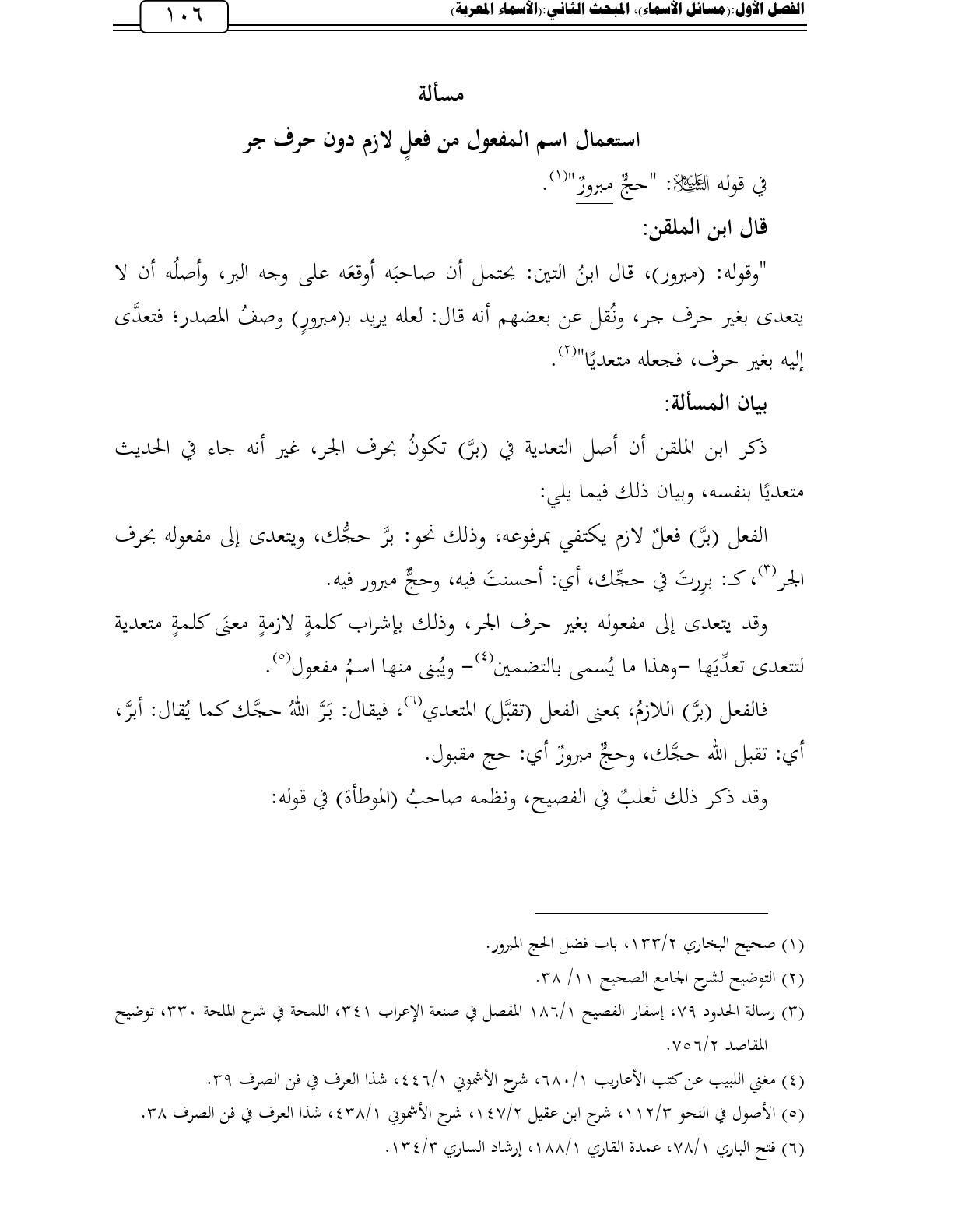 الفعل (برَّ) فعلٌ لازم يكتفي بمرفوعه، وذلك نحو: برَّ حجُّك، ويتعدى إلى مفعوله بحرف الجر (¬3)، كـ: برِرتَ في حجِّك، أي: أحسنتَ فيه، وحجٌّ مبرور فيه.