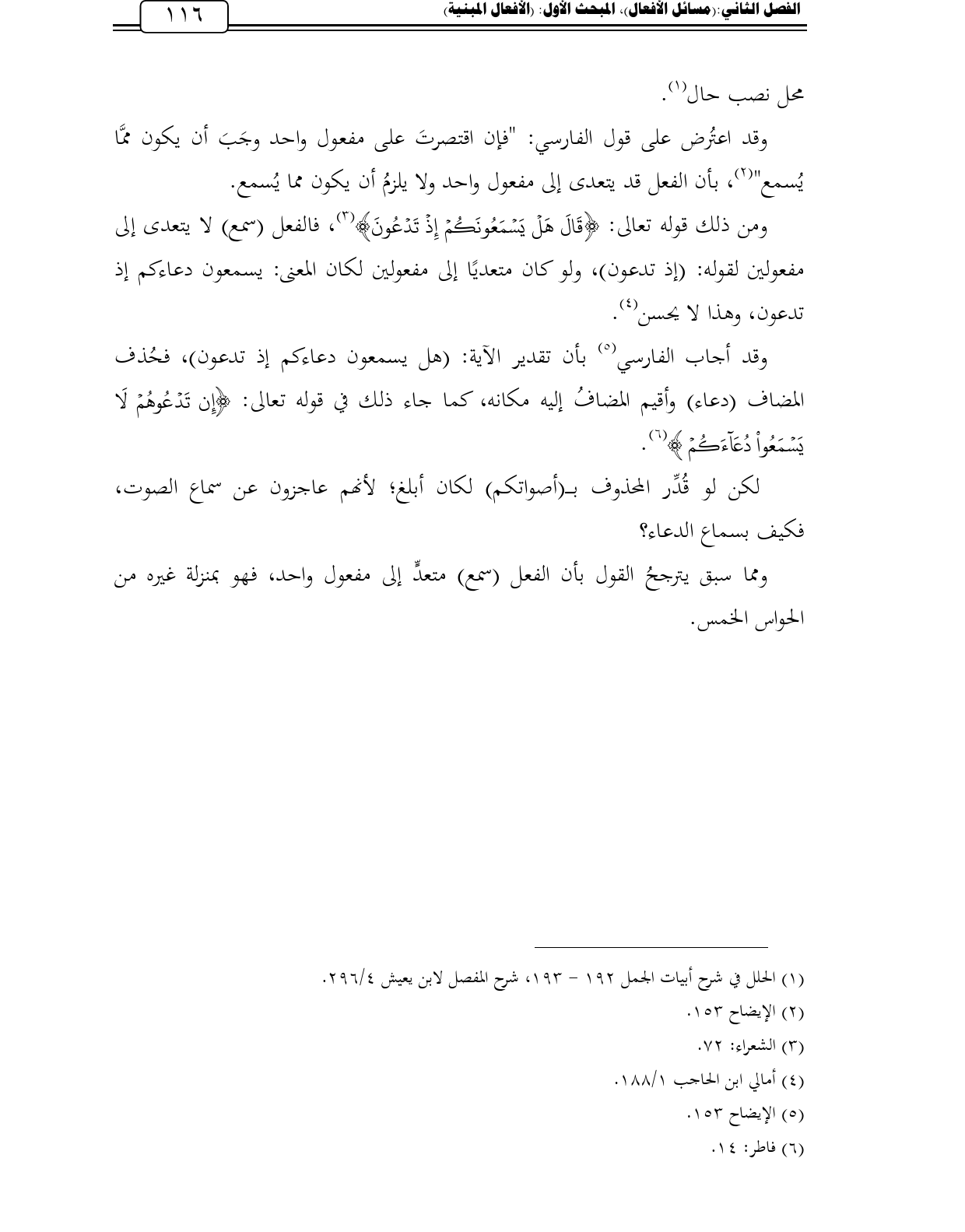 وقد أجاب الفارسي (¬5) بأن تقدير الآية: (هل يسمعون دعاءكم إذ تدعون)، فحُذف المضاف (دعاء) وأقيم المضافُ إليه مكانه، كما جاء ذلك في قوله تعالى: {إِن تَدْعُوهُمْ لَا يَسْمَعُوا دُعَاءَكُمْ} (¬6).