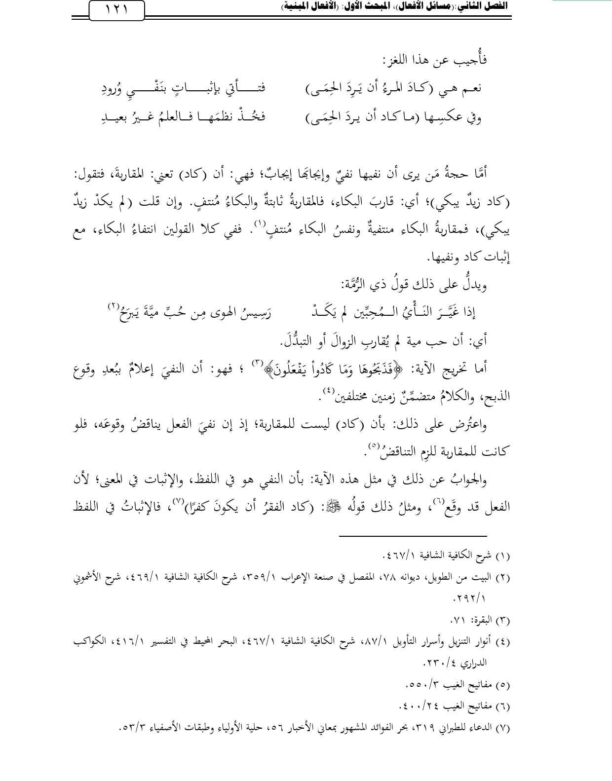 واعتُرض على ذلك: بأن (كاد) ليست للمقاربة؛ إذ إن نفيَ الفعل يناقضُ وقوعَه، فلو كانت للمقاربة للزِم التناقضُ (¬5).