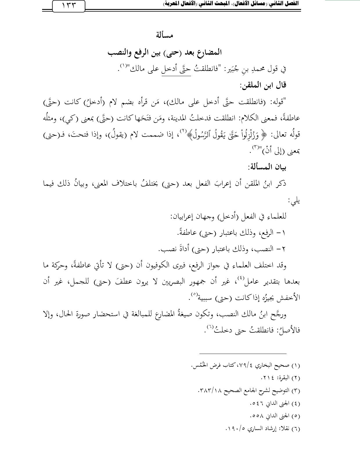 ذكر ابنُ الملقن أن إعرابَ الفعل بعد (حتى) يختلفُ باختلاف المعنى، وبيانُ ذلك فيما يلي:
