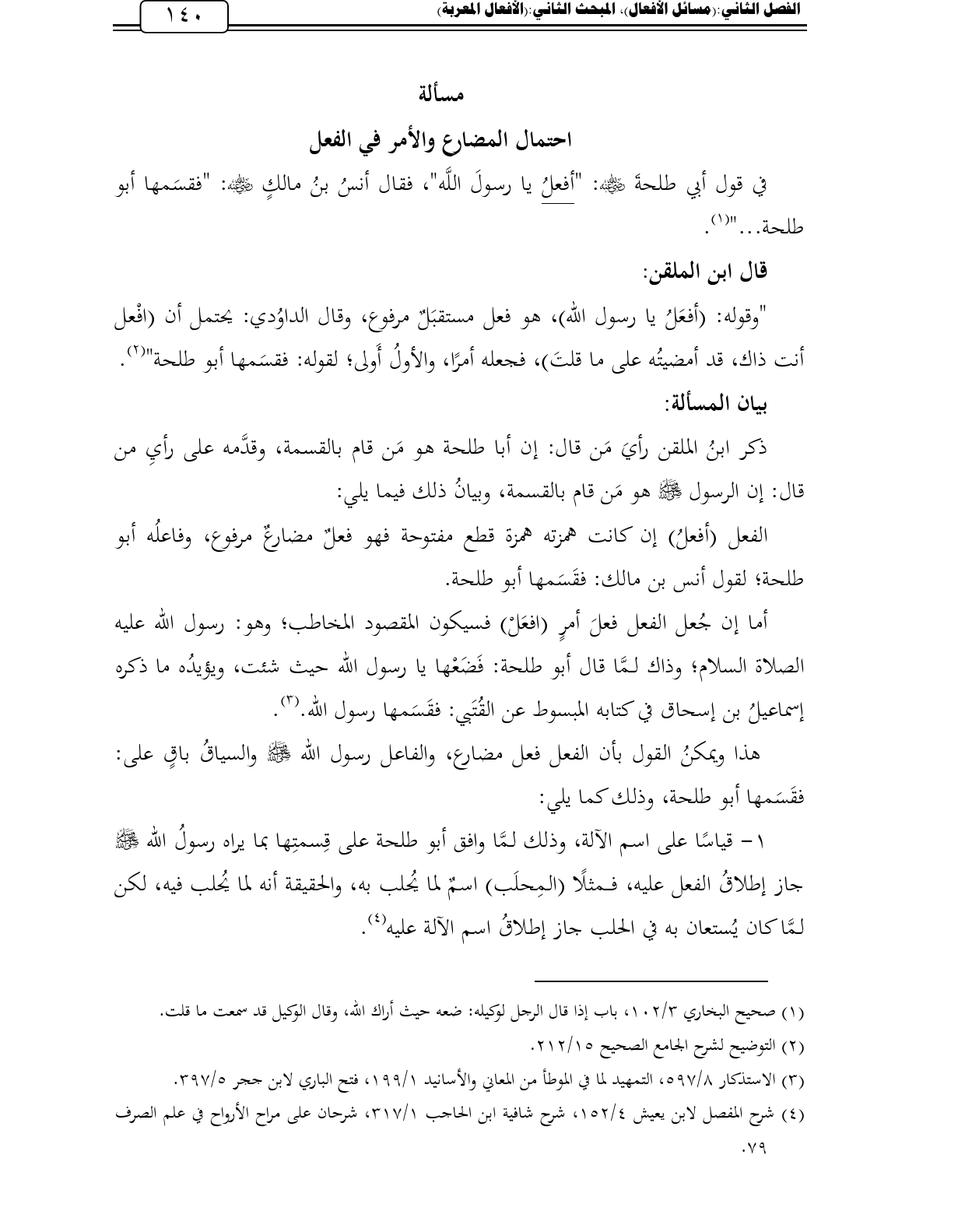 أما إن جُعل الفعل فعلَ أمرٍ (افعَلْ) فسيكون المقصود المخاطب؛ وهو: رسول الله عليه الصلاة السلام؛ وذاك لمَّا قال أبو طلحة: فَضَعْها يا رسول الله حيث شئت، ويؤيدُه ما ذكره إسماعيلُ بن إسحاق في كتابه المبسوط عن القُتَبي: فقَسَمها رسول الله. (¬3).