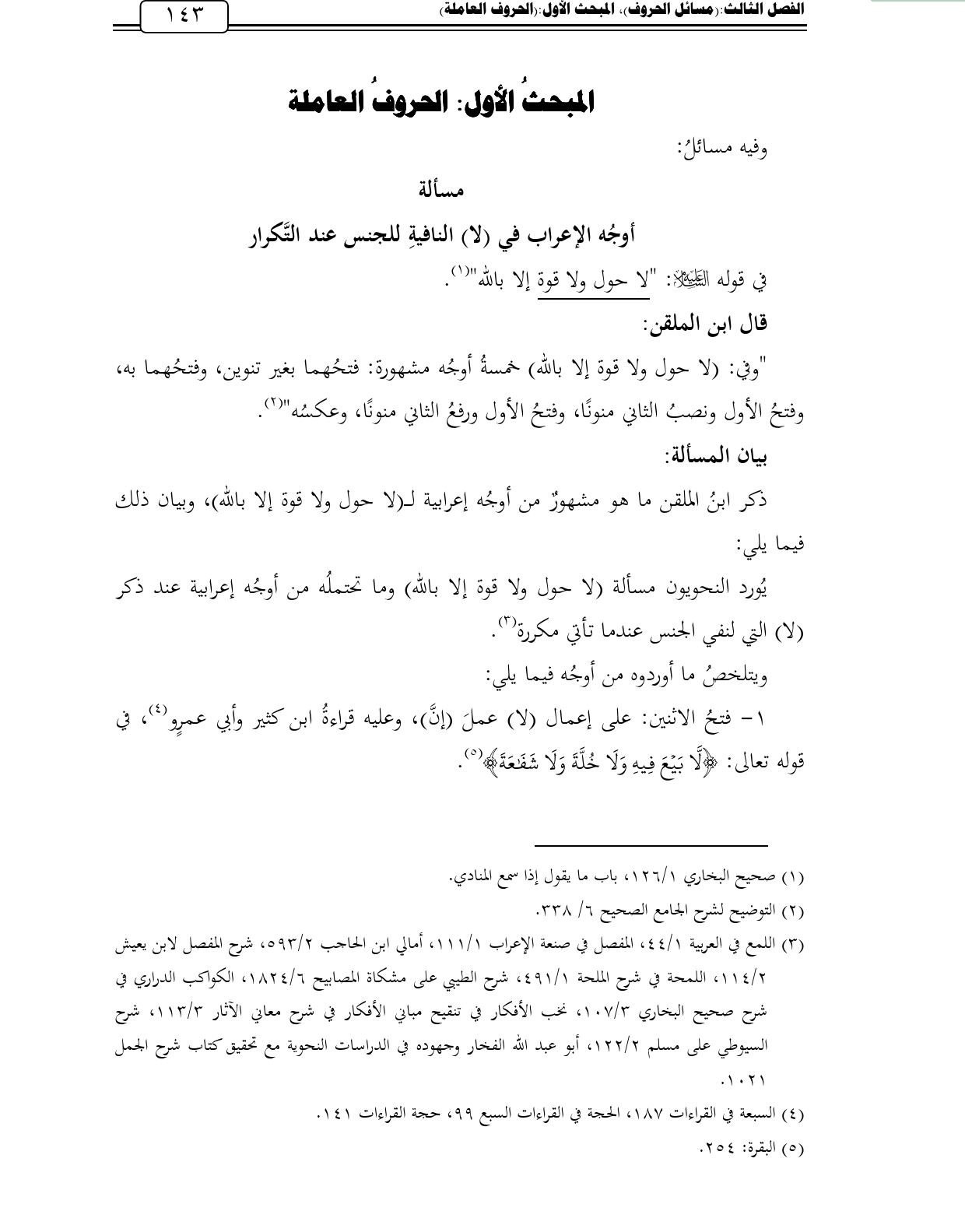يُورد النحويون مسألة (لا حول ولا قوة إلا بالله) وما تحتملُه من أوجُه إعرابية عند ذكر (لا) التي لنفي الجنس عندما تأتي مكررة (¬3).