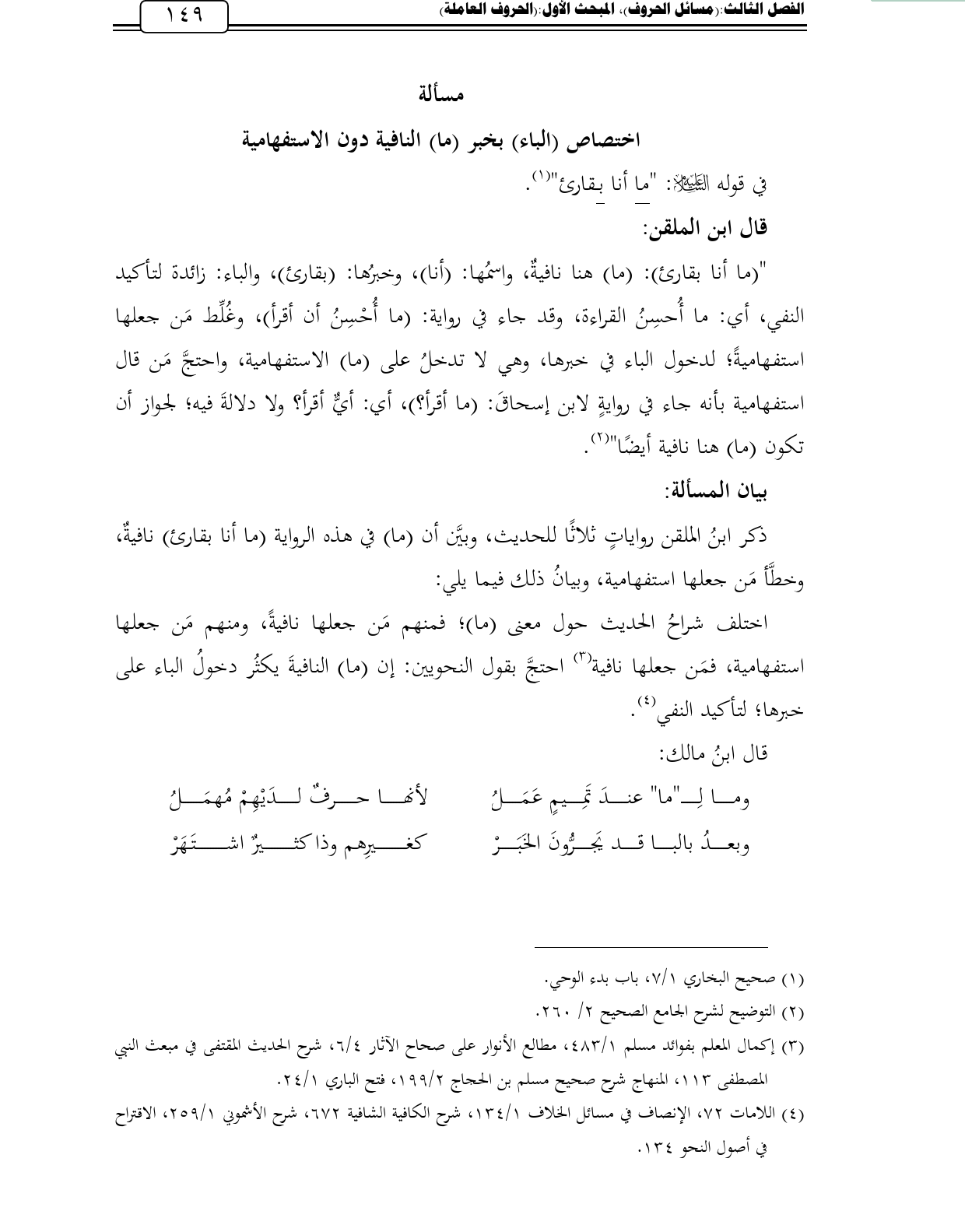 ذكر ابنُ الملقن رواياتٍ ثلاثًا للحديث، وبيَّن أن (ما) في هذه الرواية (ما أنا بقارئ) نافيةٌ، وخطَّأ مَن جعلها استفهامية، وبيانُ ذلك فيما يلي: