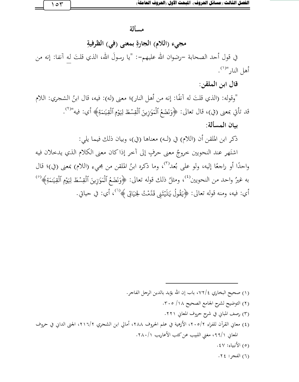 اشتَهر عند النحويين خروجُ معنى حرفٍ إلى آخر إذا كان معنى الكلام الذي يدخلان فيه واحدًا أو راجعًا إليه، ولو على بُعد (¬3)، وما ذكره ابنُ الملقن من مجيء (اللام) بمعنى (في)؛ قال به غيرُ واحد من النحويين (¬4)، ومثلُ ذلك قوله تعالى: {وَنَضَعُ الْمَوَازِينَ الْقِسْطَ لِيَوْمِ الْقِيَامَةِ} (¬5) أي: فيه، ومنه قوله تعالى: {يَقُولُ يَالَيْتَنِي قَدَّمْتُ لِحَيَاتِي} (¬6)، أي: في حياتي.