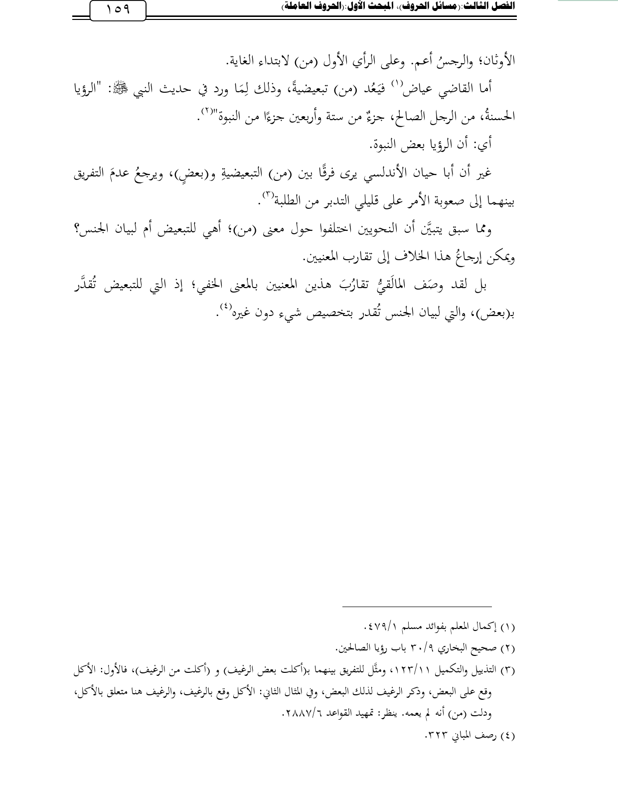 أما القاضي عياض (¬1) فيَعُد (من) تبعيضيةً، وذلك لِمَا ورد في حديث النبي - صلى الله عليه وسلم -: "الرؤيا الحسنةُ، من الرجل الصالح، جزءٌ من ستة وأربعين جزءًا من النبوة" (¬2).