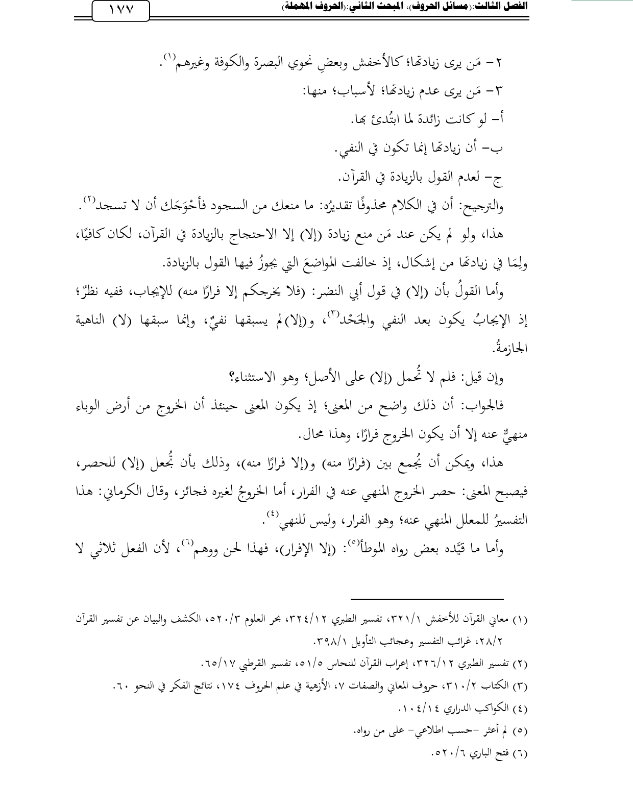 وأما القولُ بأن (إلا) في قول أبي النضر: (فلا يخرجكم إلا فرارًا منه) للإيجاب، ففيه نظرٌ؛ إذ الإيجابُ يكون بعد النفي والجَحْد (¬3)، و (إلا) لم يسبقها نفيٌ، وإنما سبقها (لا) الناهية الجازمةُ.