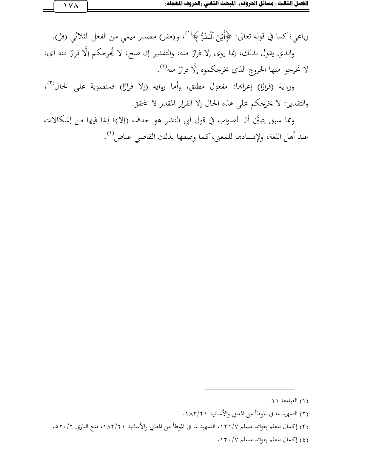 ومما سبق يتبيَّن أن الصواب في قول أبي النضر هو حذف (إلا)؛ لِمَا فيها من إشكالات عند أهل اللغة، ولإفسادها للمعنى، كما وصفها بذلك القاضي عياض (¬4).
