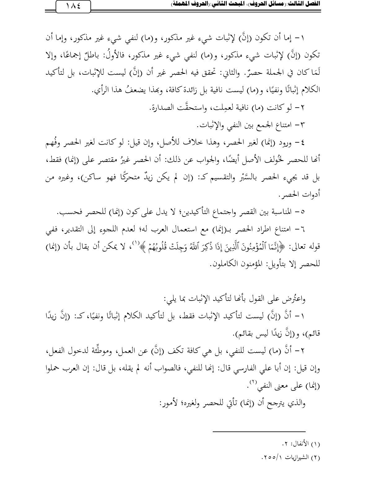 2 - أنَّ (ما) ليست للنفي، بل هي كافة تكف (إنَّ) عن العمل، وموطِّئة لدخول الفعل، وإن قيل: إن أبا علي الفارسي قال: إنها للنفي، فالصواب أنه لم يقله، بل قال: إن العرب حملوا (إنما) على معنى النفي (¬2).