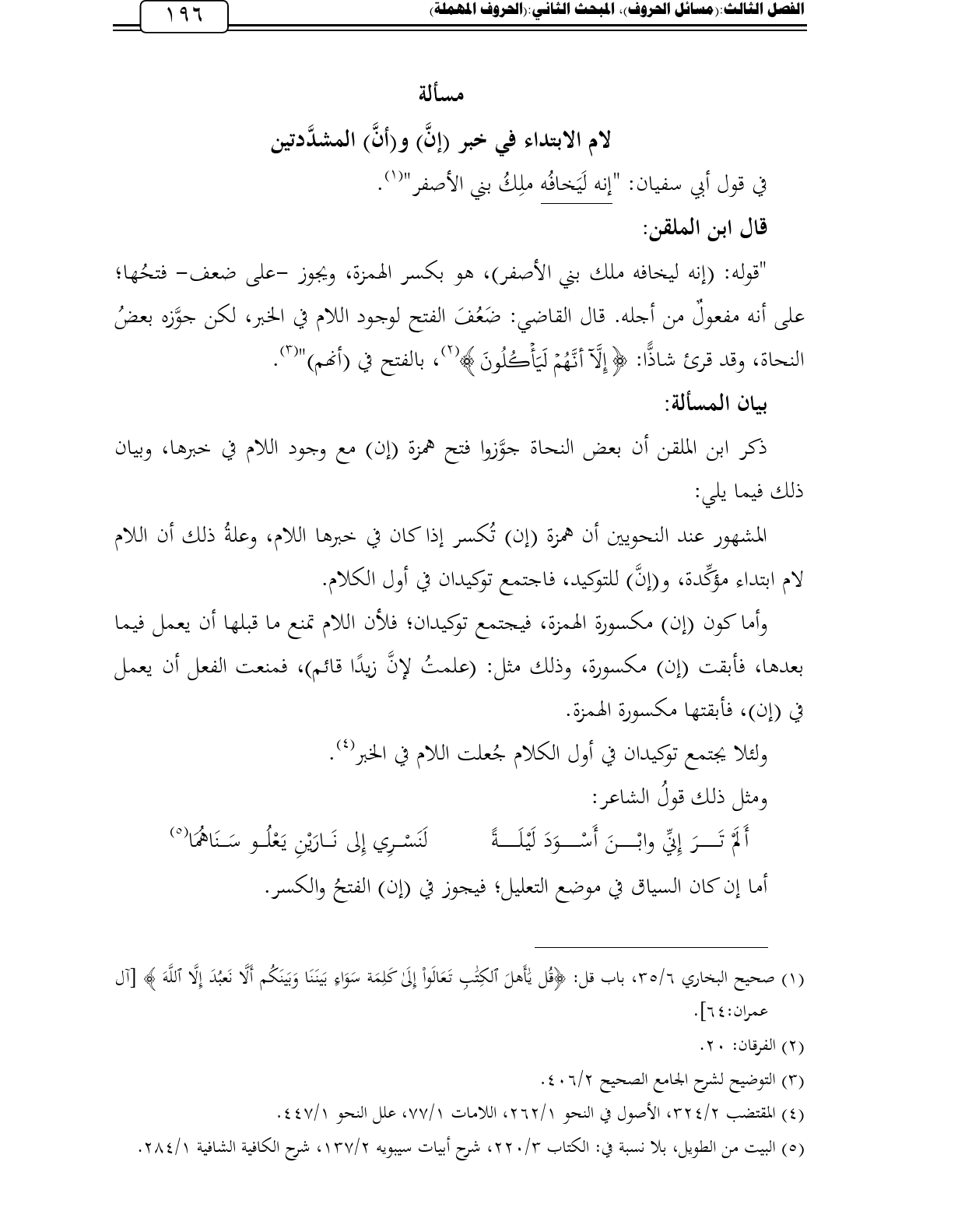 ذكر ابن الملقن أن بعض النحاة جوَّزوا فتح همزة (إن) مع وجود اللام في خبرها، وبيان ذلك فيما يلي: