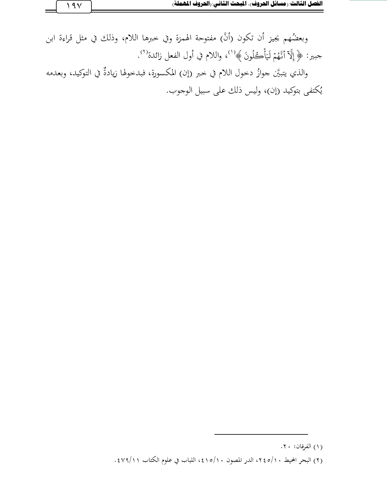وبعضُهم يجيز أن تكون (أنَّ) مفتوحة الهمزة وفي خبرها اللام، وذلك في مثل قراءة ابن جبير: {إِلَّا أنَّهُمْ لَيَأْكُلُونَ} (¬1)، واللام في أول الفعل زائدة (¬2).